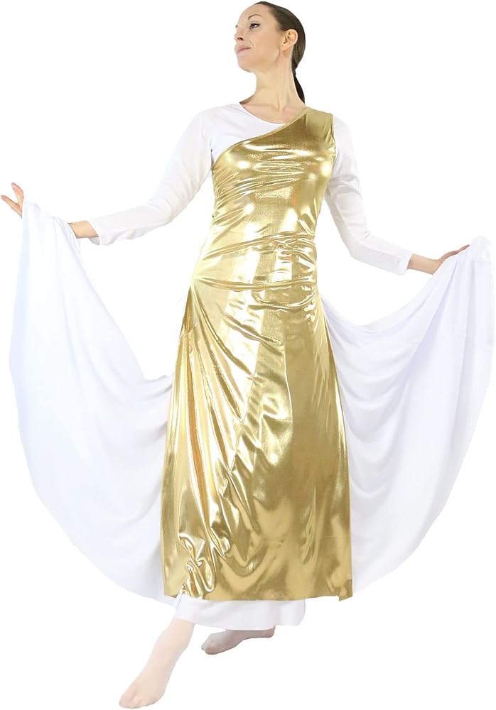 Many customers use this shiny metallic liturgical dance tunic as a layering addition to previous costumes for a different look.