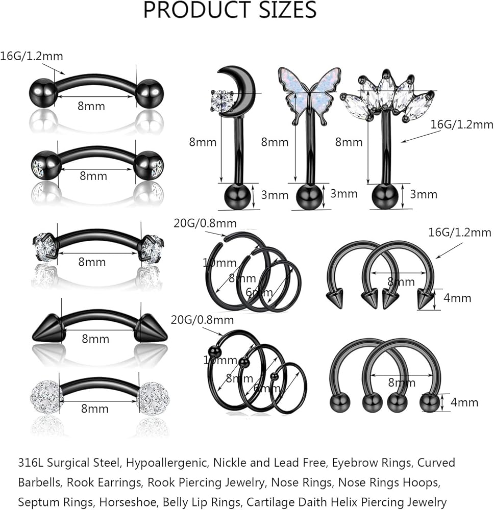 1.BENEFIT PACKAGE: 18pcs Various Style Of Nose Eyebrow Ear Rings, Unique Butterfly Design and Great Quality.The Barbell Piercings Can Be Used As Nose Rings, Nose Rings Hoops, Septum Nose Rings, Rook Piercing Jewelry, Eyebrow Piercing, Cartilage Earrings, Rook Earrings, Daith Earrings,Helix Earring, Tragus Piercing Jewelry.