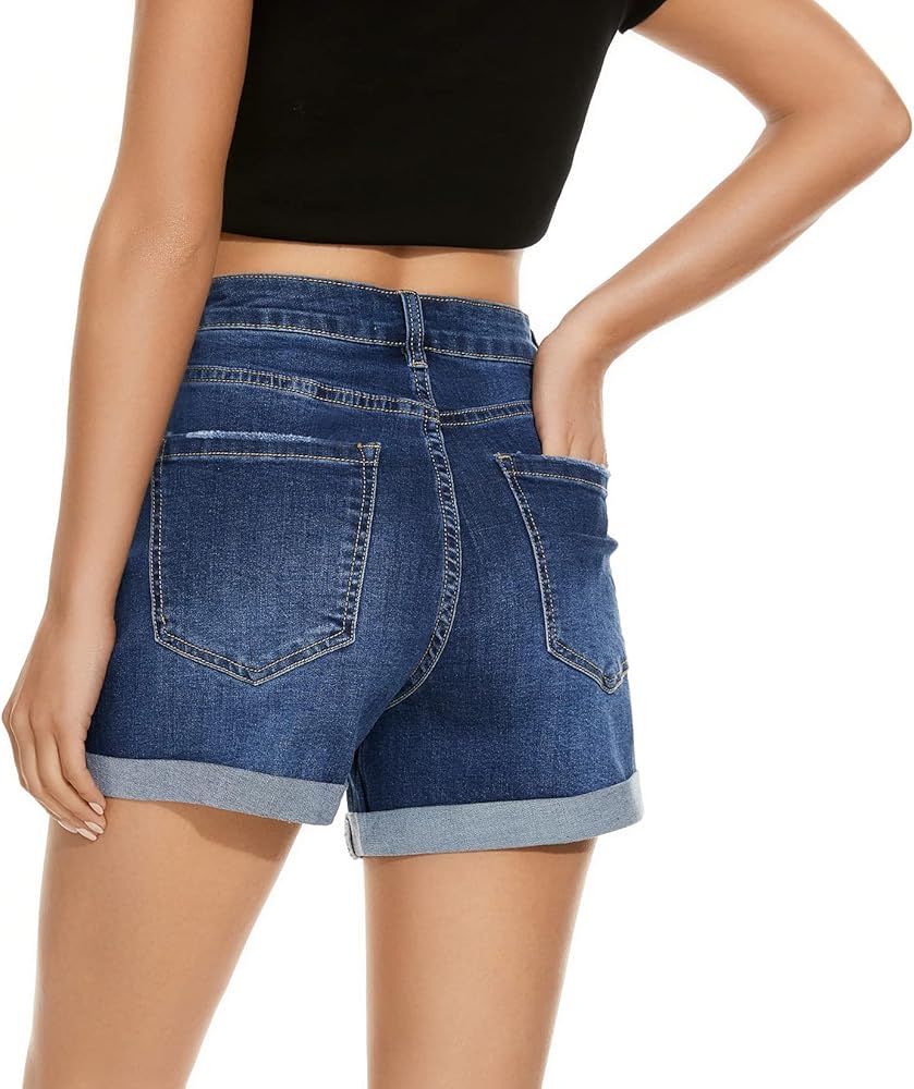 【Stylish Design】Mid rise denim shorts, classic dark blue, feature with fold roll-up hem. Classic 5 functional pockets and zip fly closure construction. hotest shorts collecton of summer.