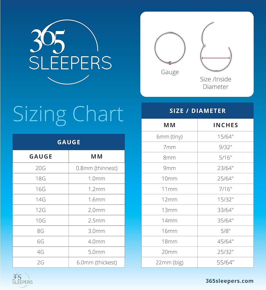 365 Sleeper Earrings have a smooth finish with no sharp edge and spin completely through the piercing making them extremely comfortable to wear. They are easy to open and close and do not require any tools. You can sleep, swim, work, or exercise with these in as they click shut and will not fall out. Your piercing should be fully healed before changing jewellery. Sleeper Earrings need to be disinfected before using.