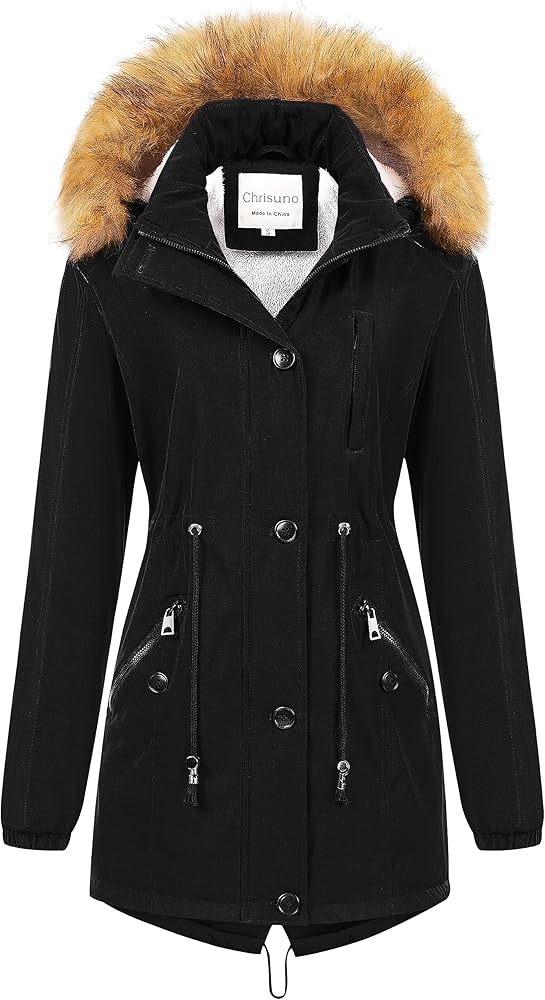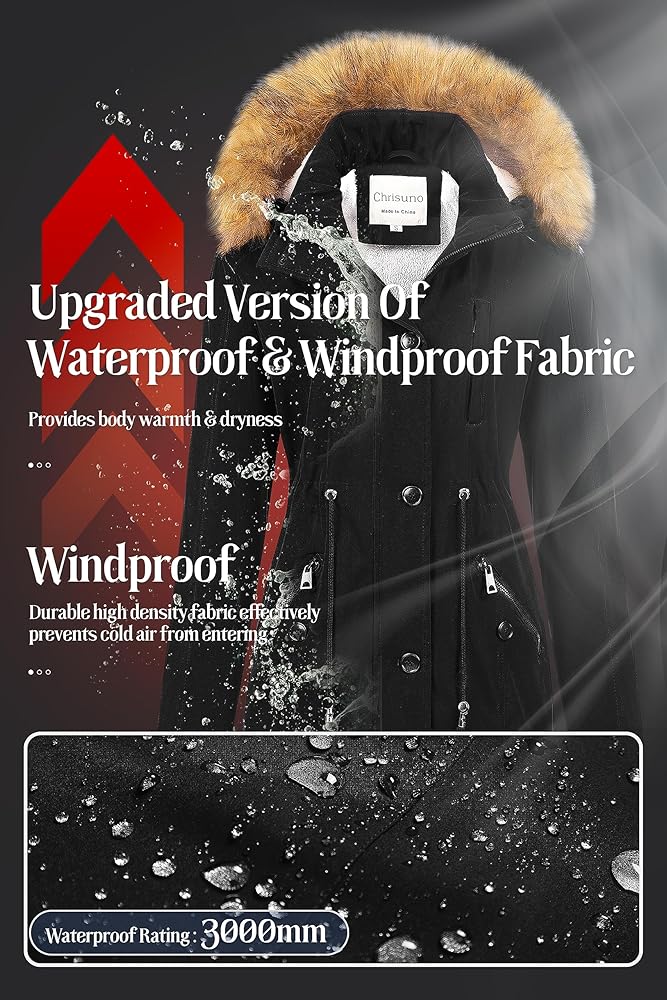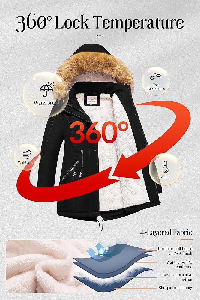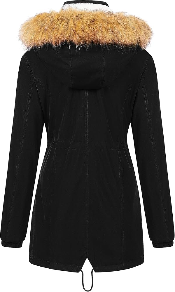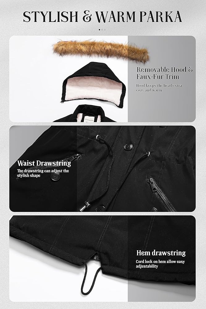 ❄Practical Functions--It's super soft,cozy&comfy.The water resistant jacket has 2 tapered tails in the back.Warm and very fashionable.Deep pockets and adjustable waist line with the draw strings.The inside is super soft furry type of material,the inside of the arms is quilted slick fabric.Deep slant pockets with snap close(2 pockets closure methods,button closure and zipper closure,allowing for easy style switching).Detachable Fur Trim.Warm tight elastic cuffs on the sleeves keep cold out