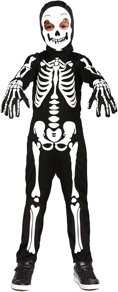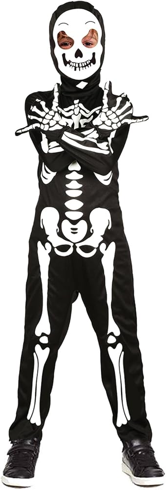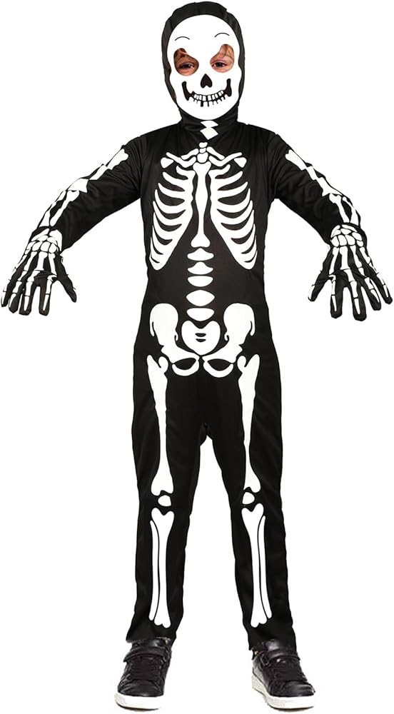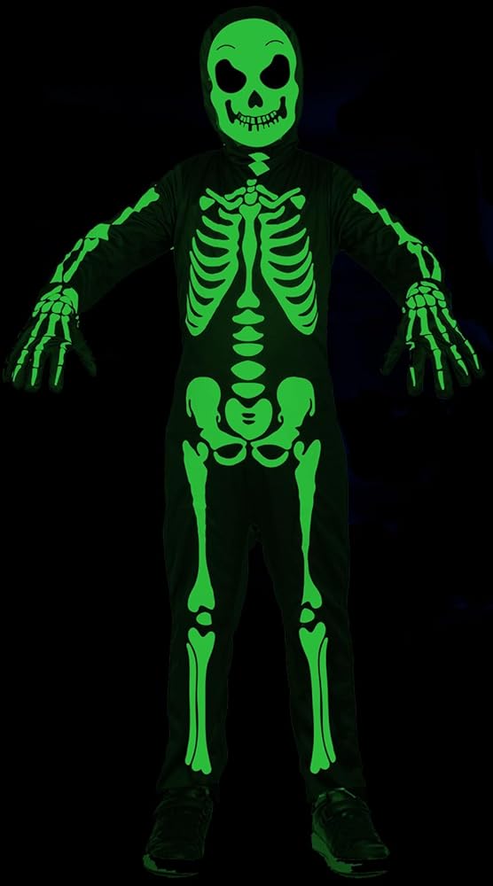 Skeleton Costume - Included 1 kids glow in the dark Skeleton Jumpsuit, Skull Hood, Skeleton Gloves.