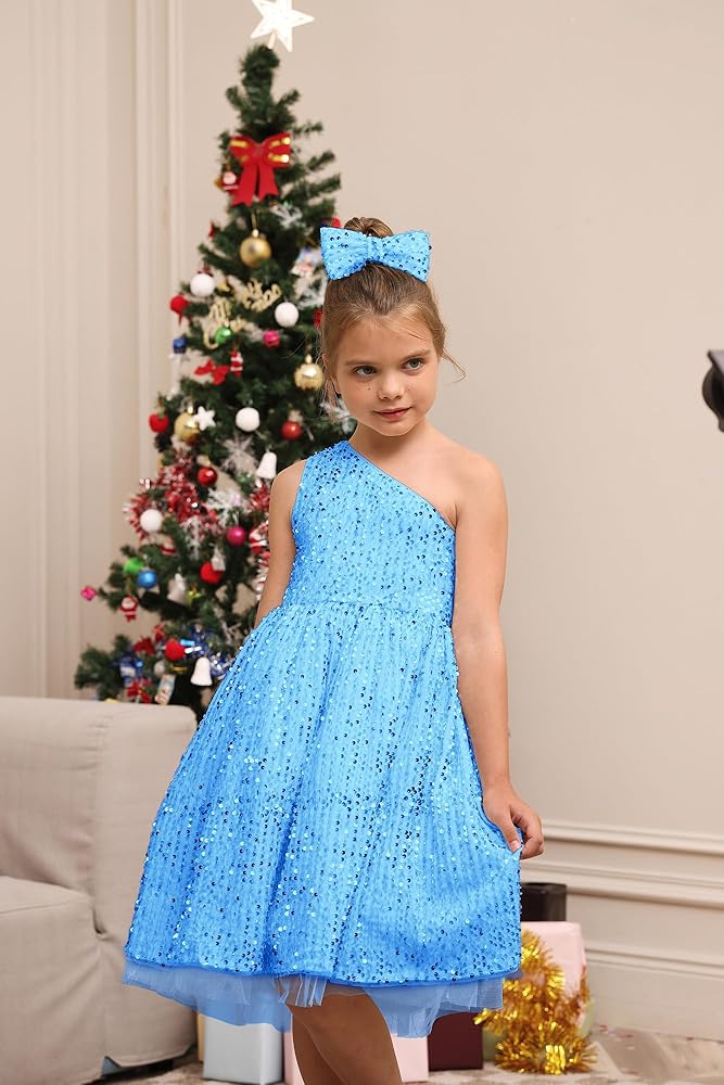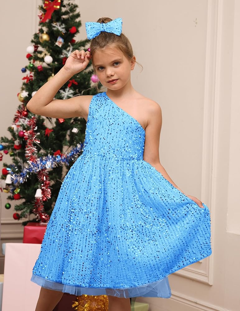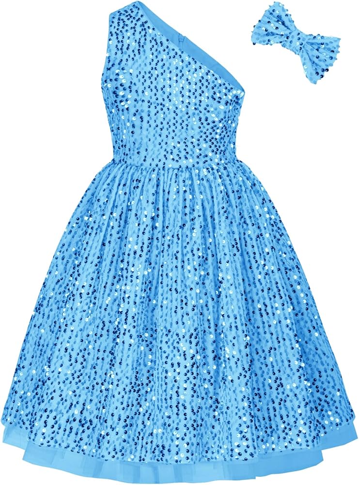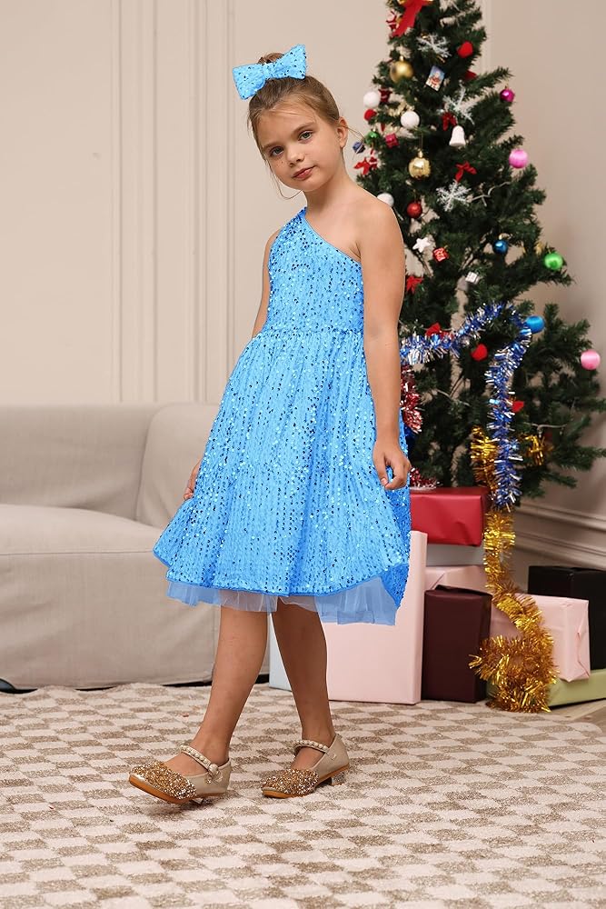【Features】Girls party dress features stylish one shoulder design with oblique neckline, a hidden zip at back for easy pulling on and off, multi-layers which make the dress fluffy, a super cute matched hair bow, sparkling sequins and full lining, cute and swing flower girl dresses for wedding.