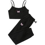 - Features: Butterfly patched, spaghetti strap, crop top, tie front, elastic waist sweatpants, fashionable
