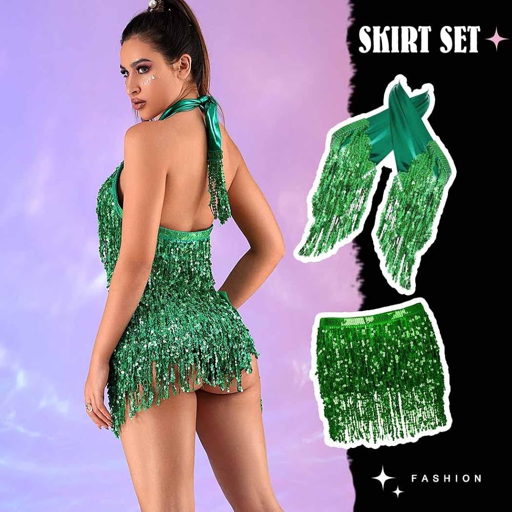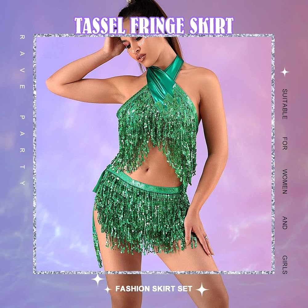 REETAN Rave Dance Outfit Sequin Fringe Skirt Top Set for Women
