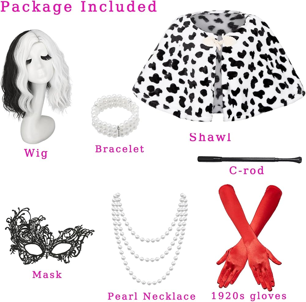 Complete Accessories Set: Our Cruella de Vil costume comes with a black and white coat shawl, wig, pearl necklace, bracelet, gloves, C-holder, lace mask, and wig cap, offering an all-inclusive transformation.