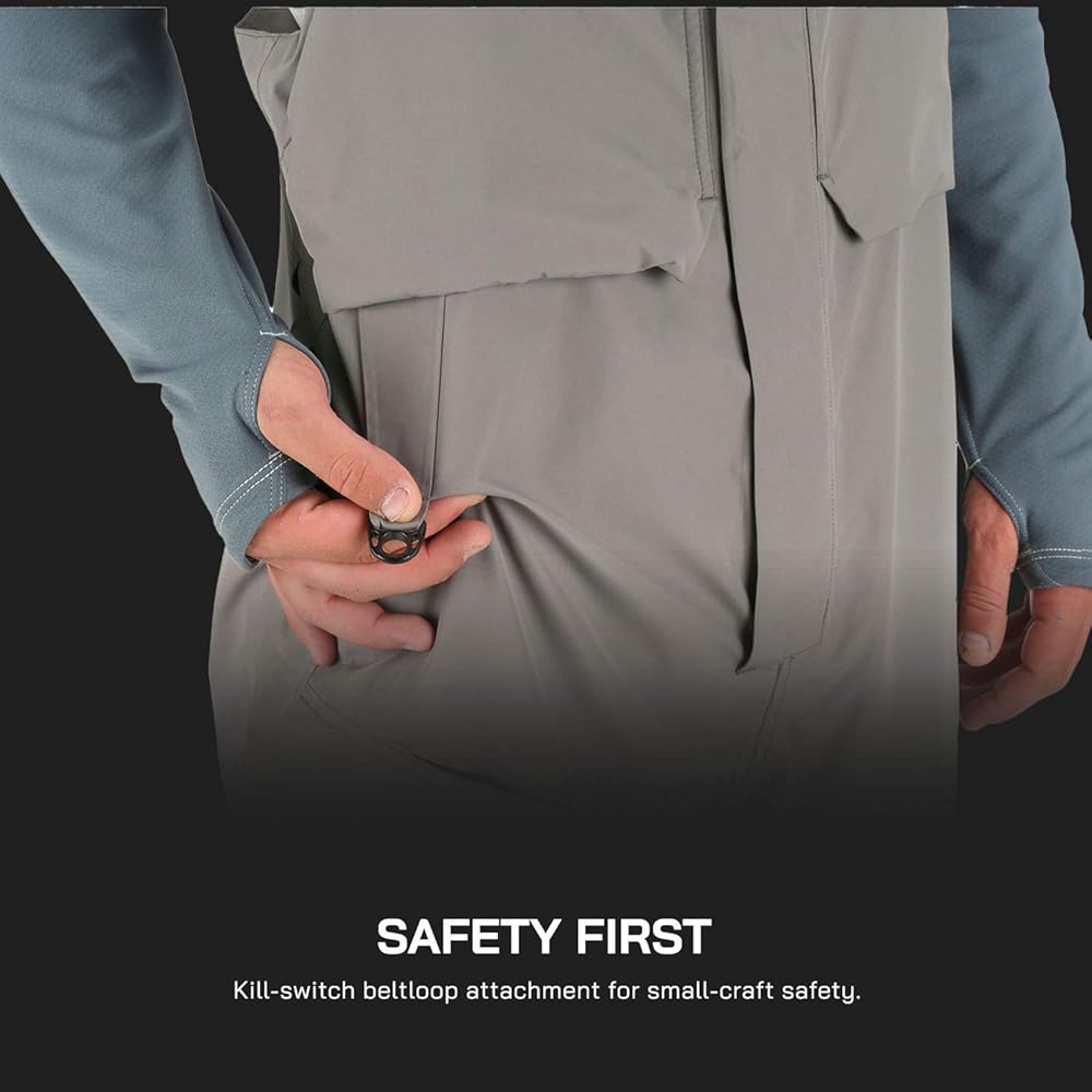 FULLY ADJUSTABLE COMFORTABLE BIBS: These angler bibs are fully adjustable. The adjustable suspenders and hem ensure a comfy fit no matter how much you're moving around. These adult bibs also feature a center-front zipper Storm Flap, handwarmer pockets, a thigh pocket, a drop-in plier pocket with a drain, and a kill-switch attachment at the belt loop.