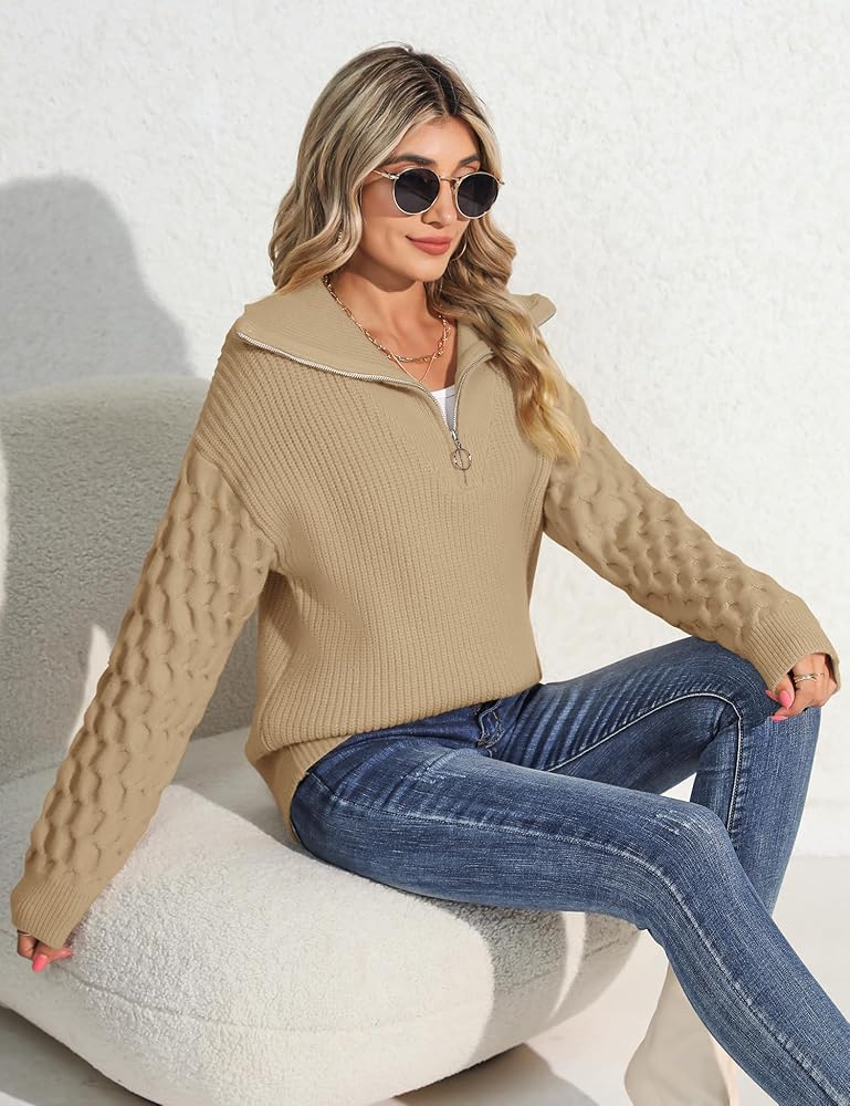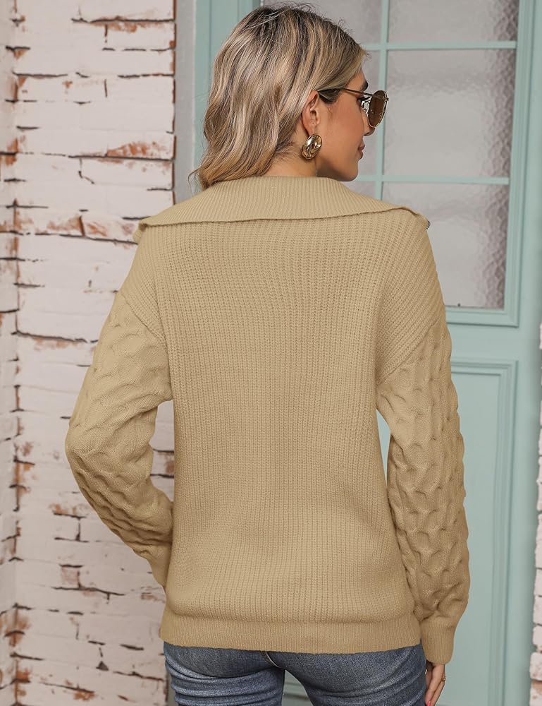 UNIQUE DESIGN - Half zip v neck colared pullover, chic cable knitted honeycomb long sleeve, drop shoulder, rib-knit cuffs and hem, loose fit, plain solid color jumper sweater with knitwear casual style, easy to match a variety of trendylLooks.