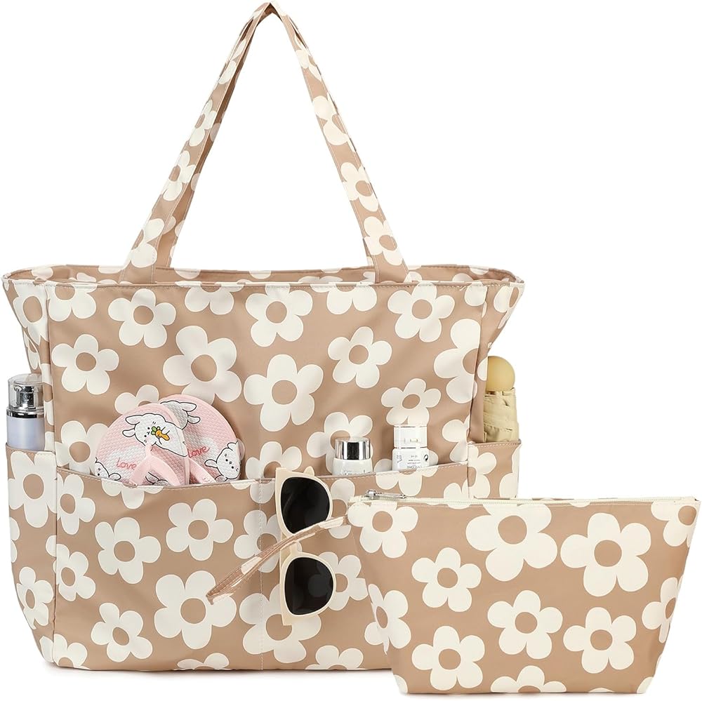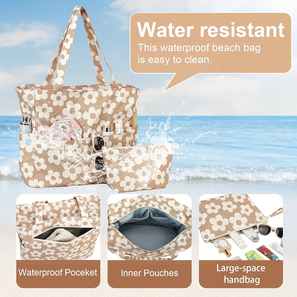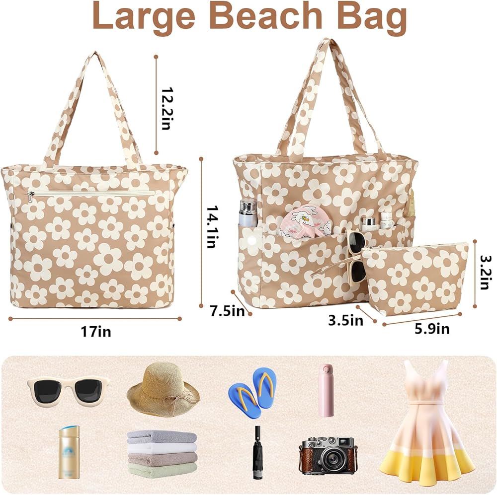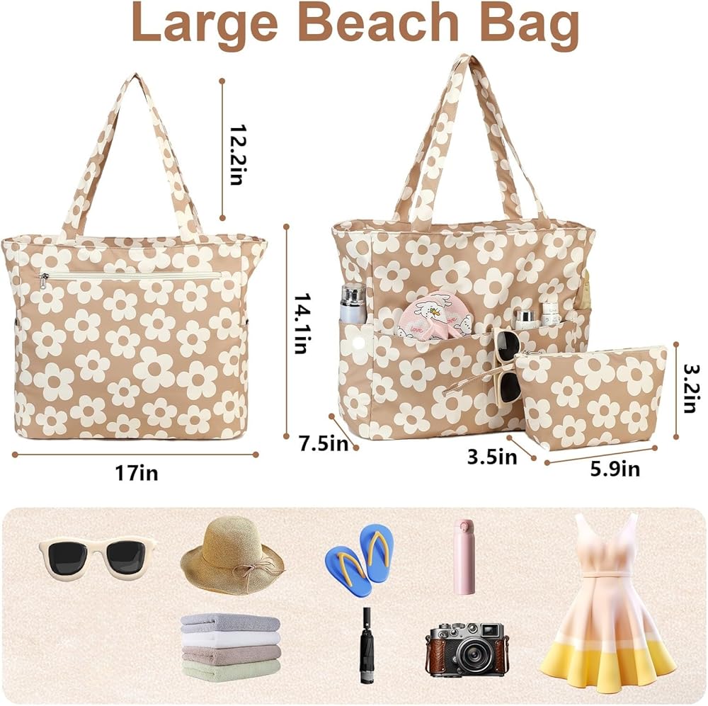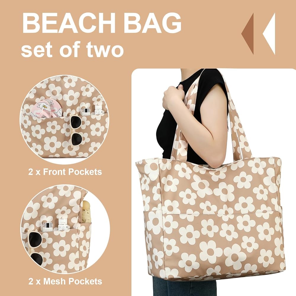 【Zipper Closure Tote Bag 2 set】LOIDOU Top zippered Waterproof beach bag tote come with a make up bag. Tons of capacity meets all the daily needs of a family's beach trip.The tote bag can hold 3-4 large beach towels,slippers,various sunscreens,sun hat and toys,water bottle, still with plenty of room left, a great utility tote bag.