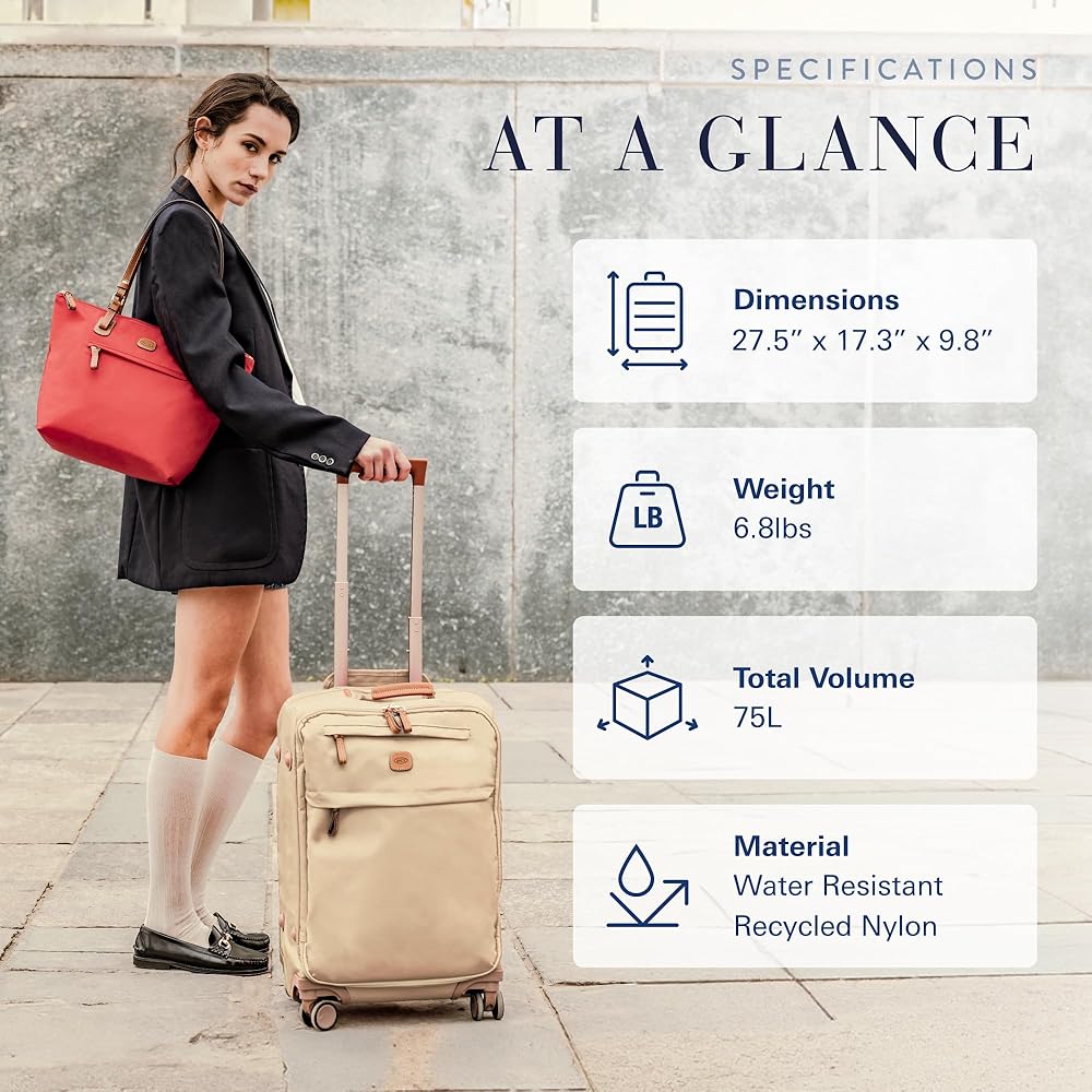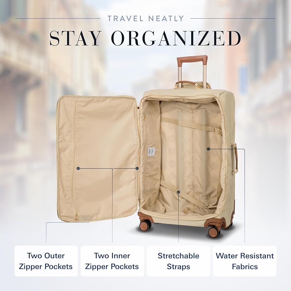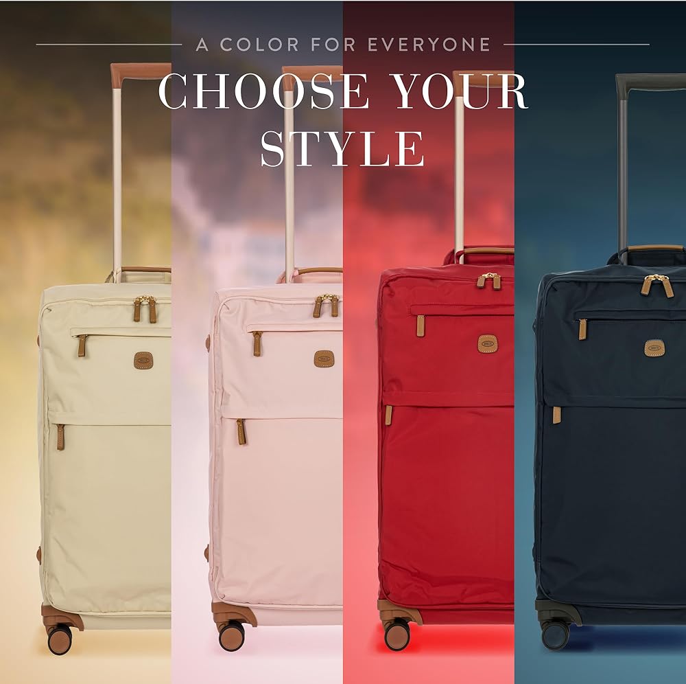 Style and function merge with Bric's X-Bag Spinner with Frame - 25 Inch roller suitcase, made from Polyamide with PVC Coating that includes a durable satin finish making this travel suitcase water-resistant and easy to clean. With perfect portability, this suitcase features a flexible frame that is sturdy and spacious enough to accommodate 4-5 day trips. Board any flight, train, or cruise and identify your checked bag immediately with our trendy and elegant accents made from genuine Tuscan leather and an easy-to-use lightweight aluminum pull-handle system for quick and smooth functionality. Get on the go with this spinner luggage complete with convenient and easily accessible dual zip front pockets, a roomy interior with two pockets, and elastic straps to secure all of your belongings. Enjoy a smooth and calm travel experience with our chic, ultra-light, and practical luggage with noiseless, dual swivel wheels for seamless mobility at any travel hub. We are inspired by the sweet moments in life where adventure and luxury meet–unlock your next journey with Bric's designer luggage.