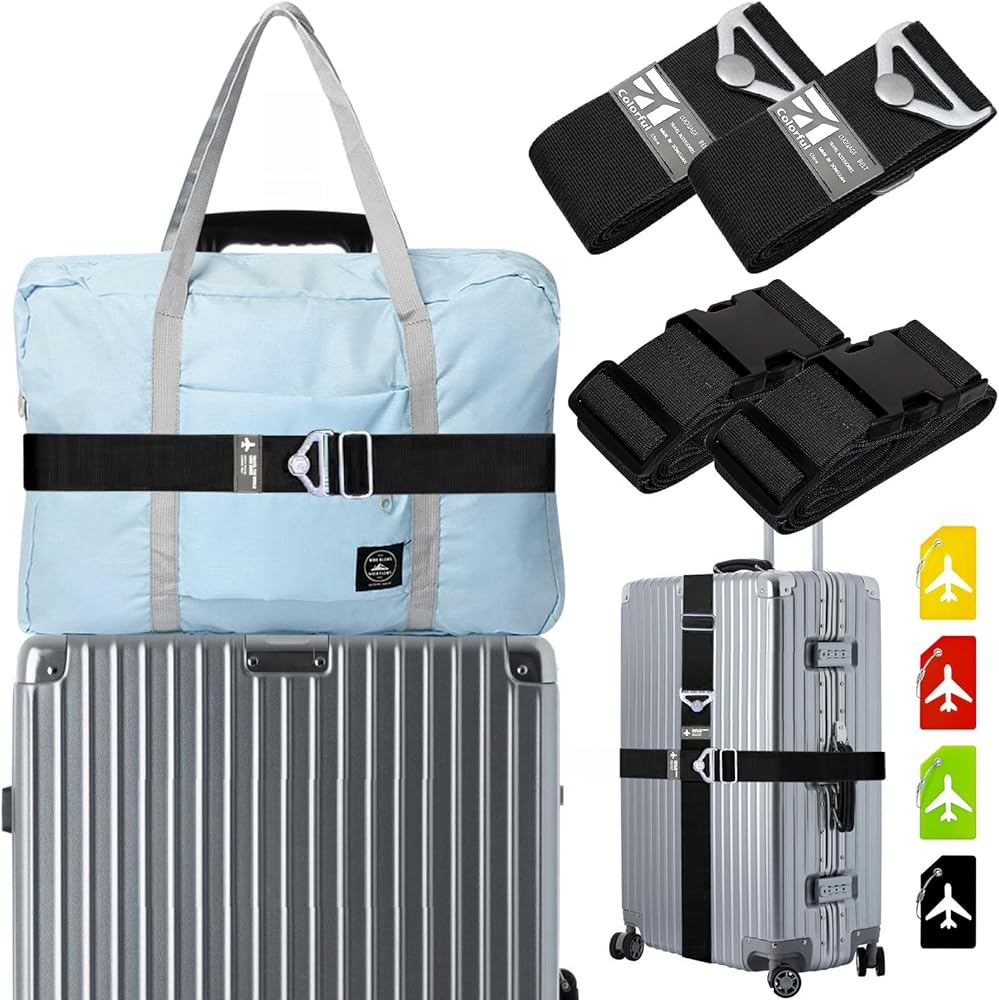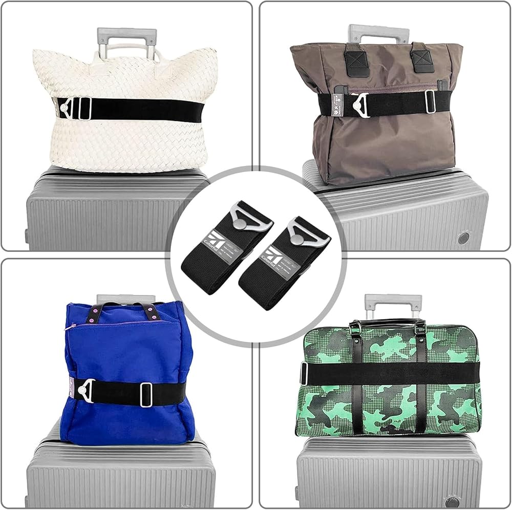 حزام سفر 2 في 1 لأحزمة الأمتعة، قطعتان من الحزام القابل للتعديل لحقيبة الأمتعة، حزام سفر للأمتعة فوق المقبض، أحزمة سفر للأمتعة مع حزامين أمتعة بكلمة واحدة و4 بطاقات أمتعة من جل السيليكا
