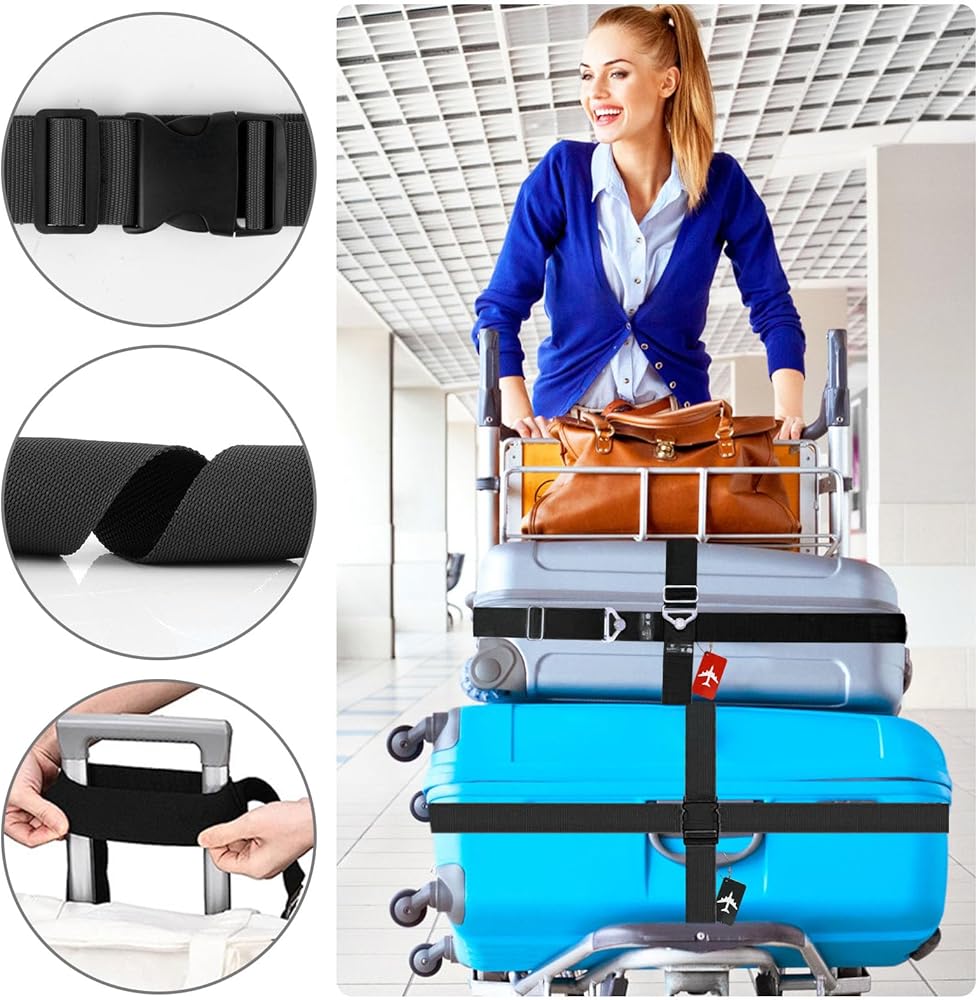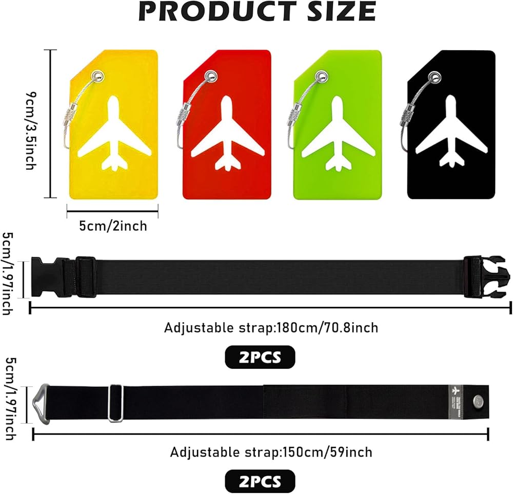 2 × حزام سفر 2 في 1 لأحزمة الأمتعة، 2 × حزام أمتعة أسود بكلمة واحدة، 4 × بطاقة أمتعة من جل السيليكا (أسود، أخضر فلورسنت، أحمر، أصفر)