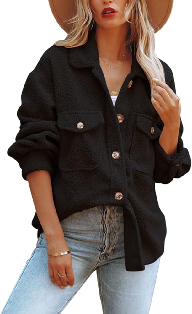 This sherpa shackets features a lapel collar, long sleeves with button cuffs, front snap button closure, Finished with front and side pockets, boyfriend style, Curved hem, cute and charming, the fuzzy jackets can be wear as a shirt or jacket, wear as 3/4 sleeves or full sleeve