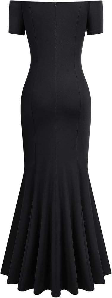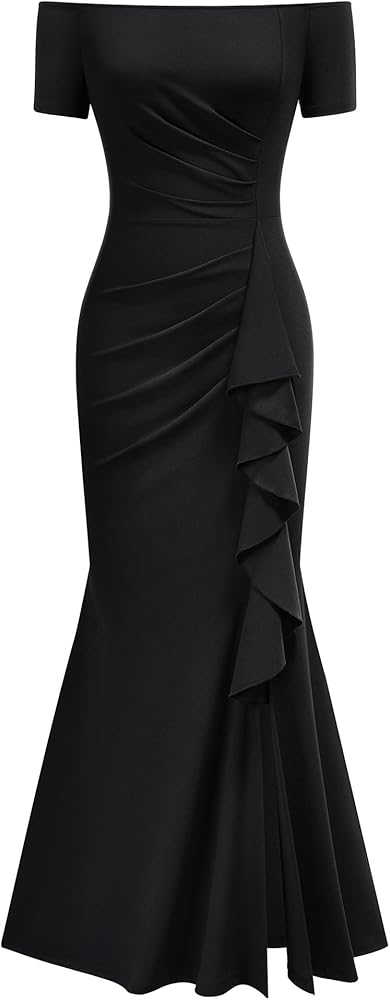 Features: Slimming bodycon design includes floor length, sexy off shoulder, short sleeves, pleated ruffle trim and high split. The graceful color will compliment most figures.