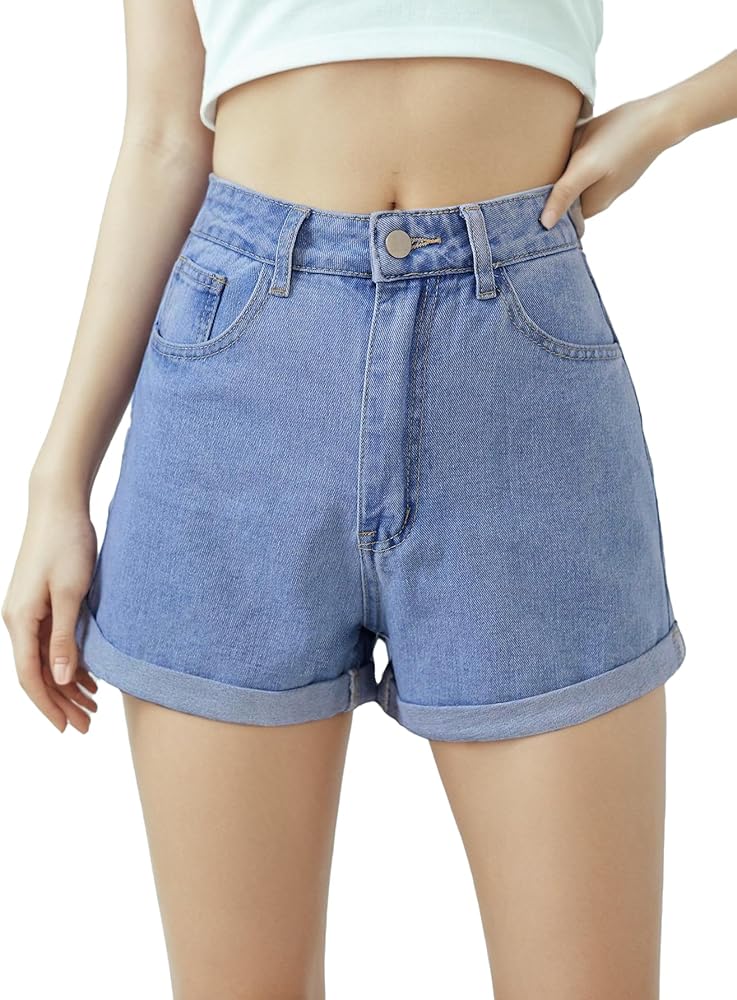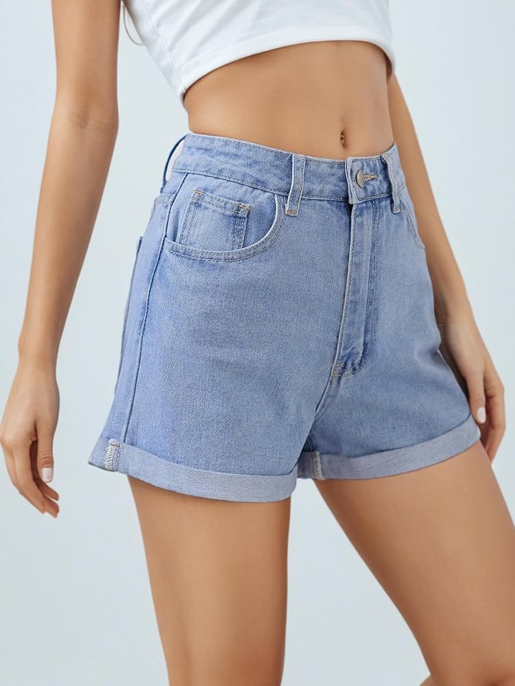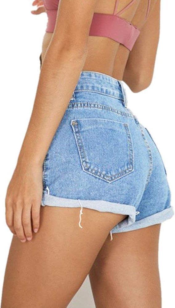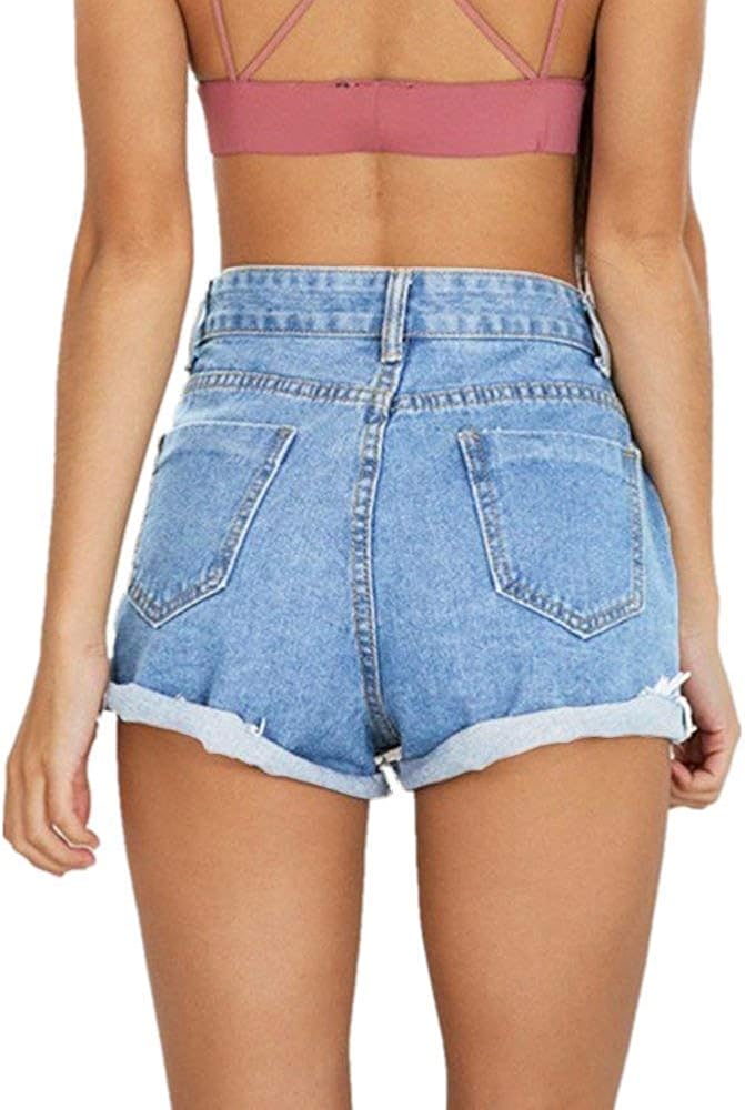 Feature:Denim High Waisted Folded Hem Jeans Shorts,Zip with Button Closure,folded hem,distressed,ripped,high waist,Great stretch,The pockets in front and back are large and deep
