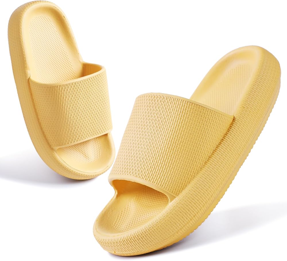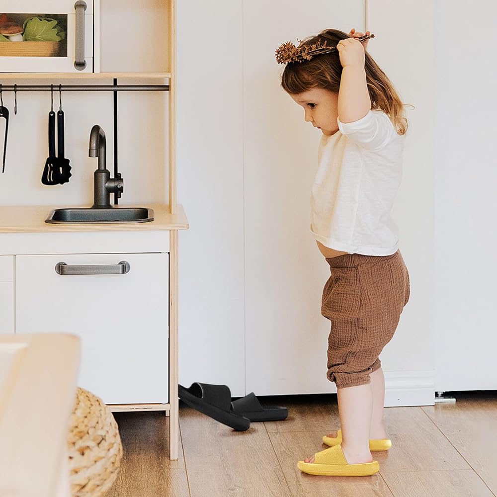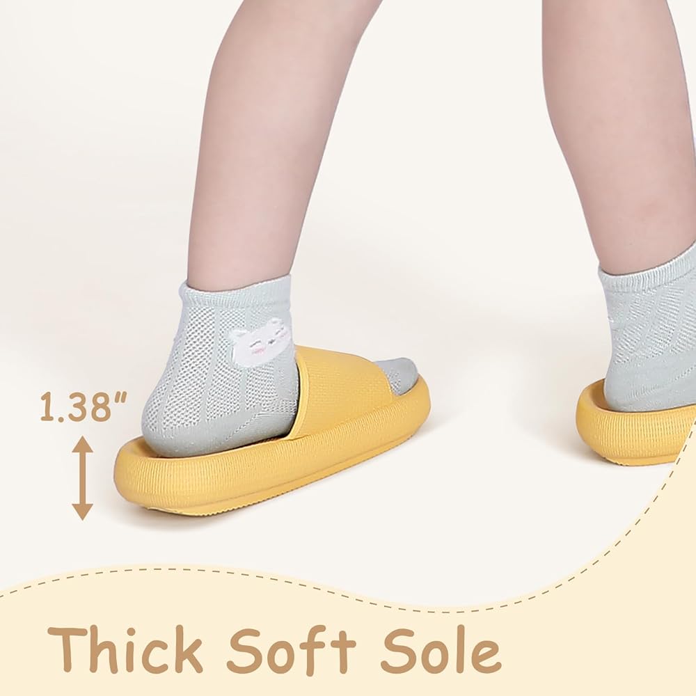 ERGONOMIC DESIGN: The EVA kids slippers are slightly recessed to perfectly wrap the feet, and the toes are slightly upturned by 15°, and the fit angle balances the pressure, which is in line with the ergonomic design. Pillow slides slippers can be worn all day long without any fatigue caused to your child's feet or ankle.