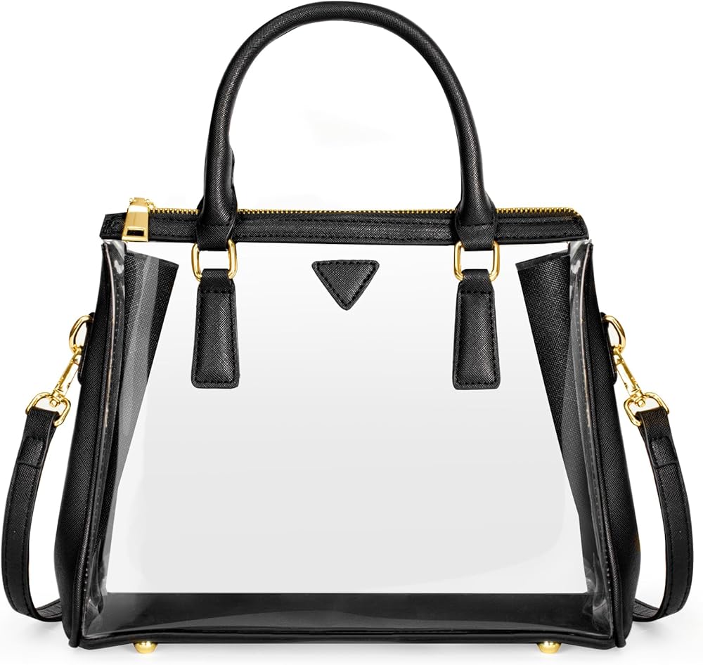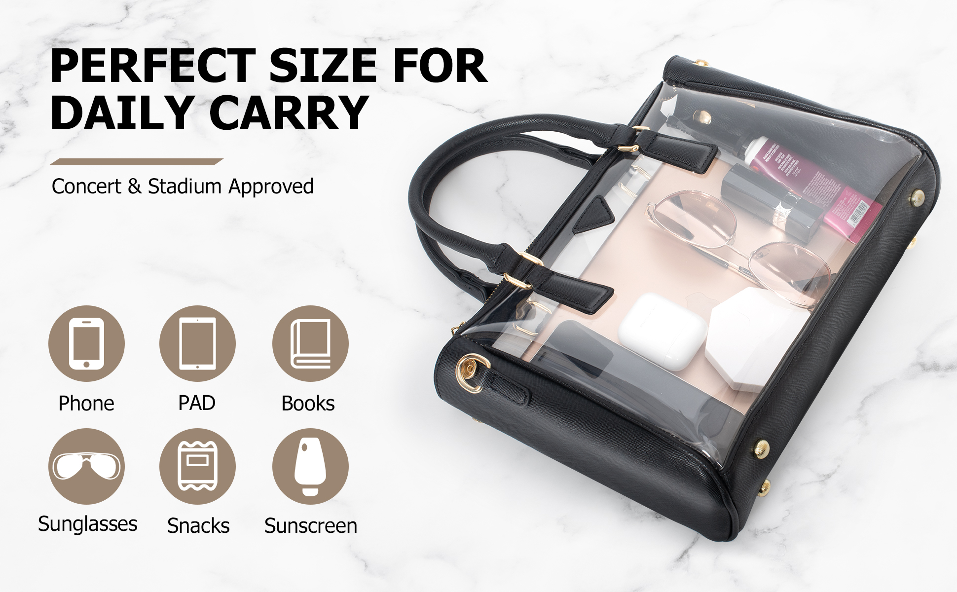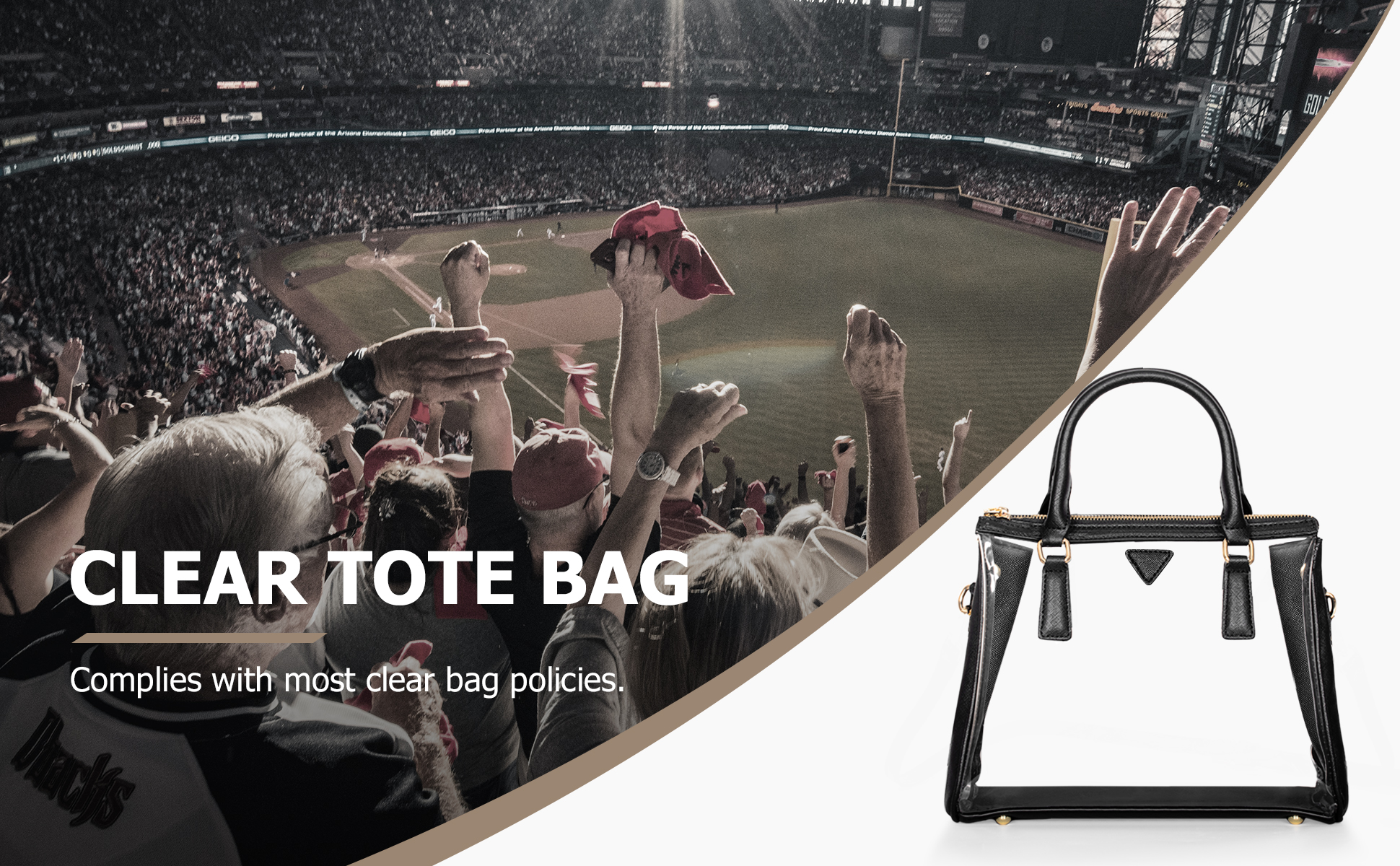 Stadium Approved: Designed for stadium bag policy, sizes 11.5" L x 9” H x 3.9” W, double tote handles 3.9" drop, falling under the maximum regulated size most commonly required by secure venues. This clear purse for women helps you get through security much easier and keep you trendy and stylish in sports events, concerts, games, and festivals.
