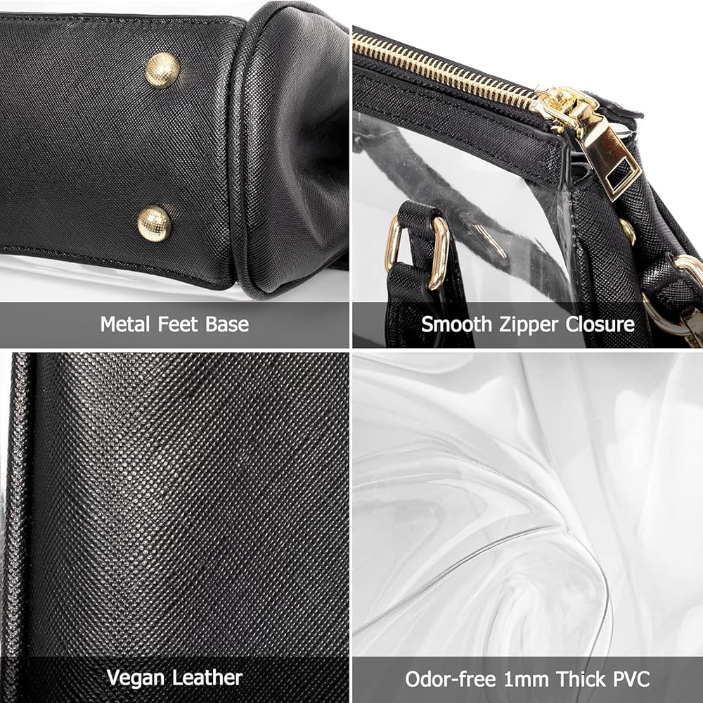 Elegant, Luxury and Durable: We made this clear tote bag with high fashion quality standards to keep you elegant in any event. Crafted from heavy-duty 1 mm thick PVC and vegan leather trim, golden-tone hardware and chic grommets details, smooth zipper closure, and metal feet protect the bottom of the bag. Odor-free, not easy to crack, puncture, melt, or disintegrate.