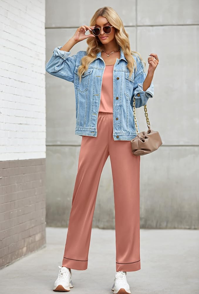 UTILITY SET DESIGN: This Satin Silk Smooth Pjs Lounge Set features adjustable spaghetti strap for easy wearing. The Soft Nightwear Pants sewn hit at the perfect spot right above the trousers bottom line, and with functional pockets, this satin sleep set is cool and silky enough for any leg type.