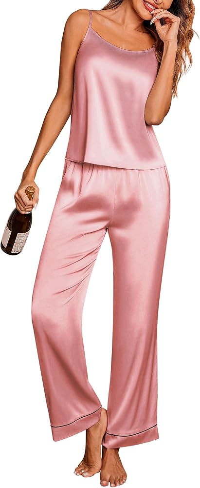 SLEEPWEAR FEATURES: This Satin Lingerie Pajamas for Women Nightwear set top is designed with sexy camisole and contrast color round neck, perfect for a relaxing day or night. Ekouaer Pjs Lounge Pants features elastic waist, makes you really comfy.