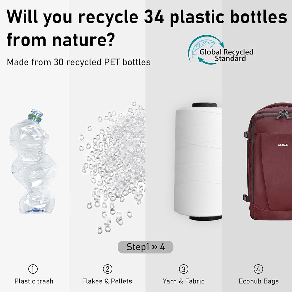 【RECYCLED PET HIGH QUALITY FABRIC】: ECOHUB carry on bags are 100% eco-friendly because it is made from 30 PLASTIC PET bottles! Recycled fabric is water-resistant and lightweight and certified by GRS. Also built with Heavy Duty SBS brand zippers, reinforced ripstop stitching. ECOHUB travel bag guarantees the top quality.