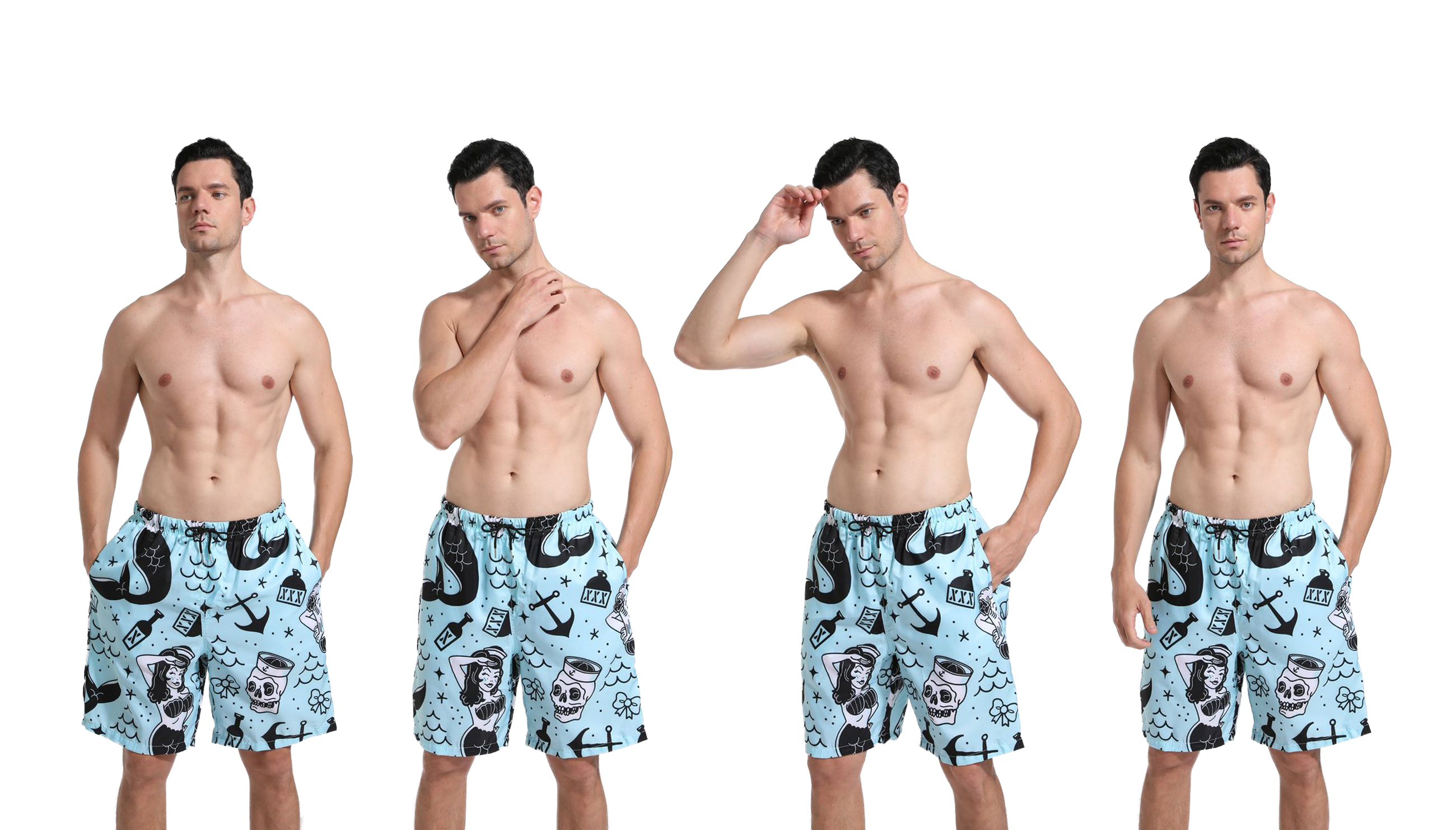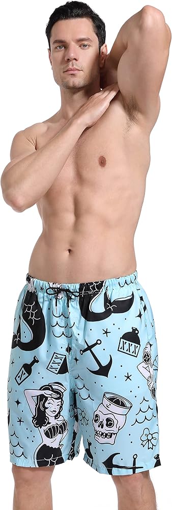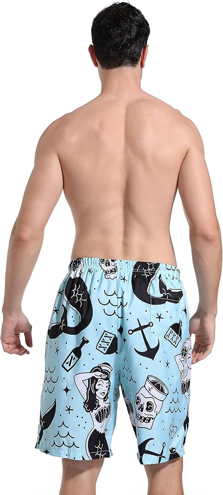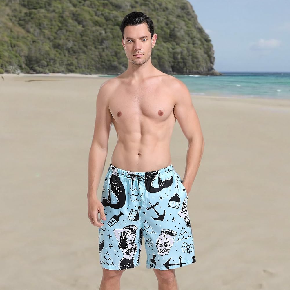 SARA NELL Mens Fashion 3d Printing Cut Medium Length Mermaid And Skull Mint Blue Beach Shorts Beach Board Shorts Unique Funny Personalized Festival Gift Shorts Beachwear Bathing Suits,Funny And Attracting.Without Ever Fading, Cracking, Peeling Or Flaking.
