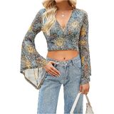 - Features: V neck, long sleeve, bell sleeve, ruffle sleeve, wrap front, solid