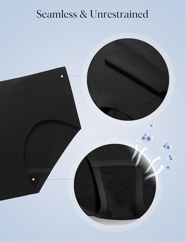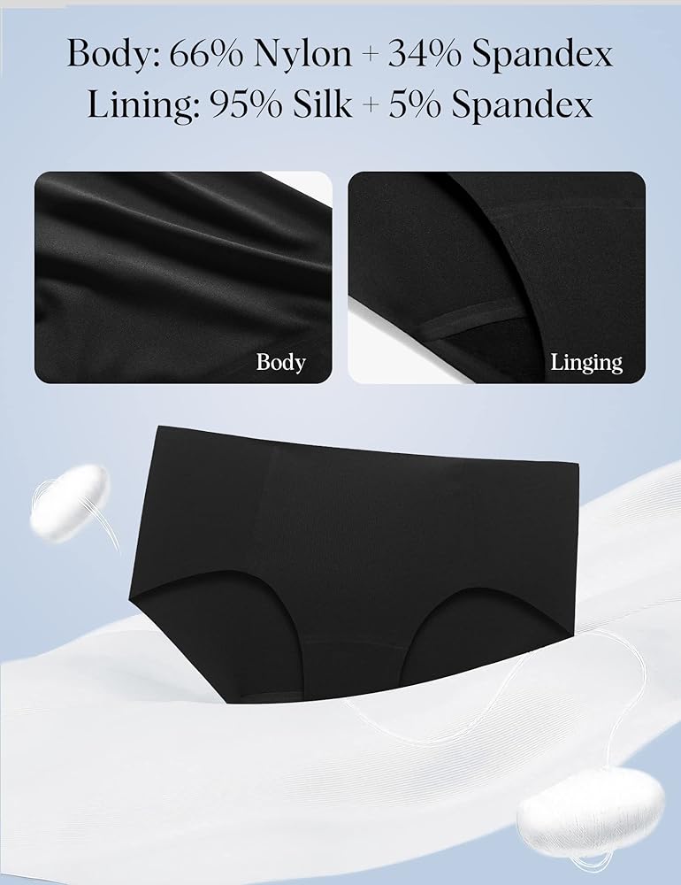 SEAMLESS, MID WAIST, SILK CROTCH: Seamless style knitting, ultra soft and breathable. Silk panties can keep you stay dry and comfortable all day long, enjoy the whole day of comfort. No sagging, no binding or pilling.