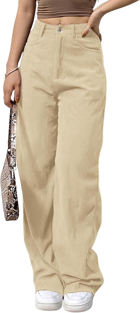 - Casual women wide leg high rise corduroy pure color pocketed stem-pipe streetwear casual pants