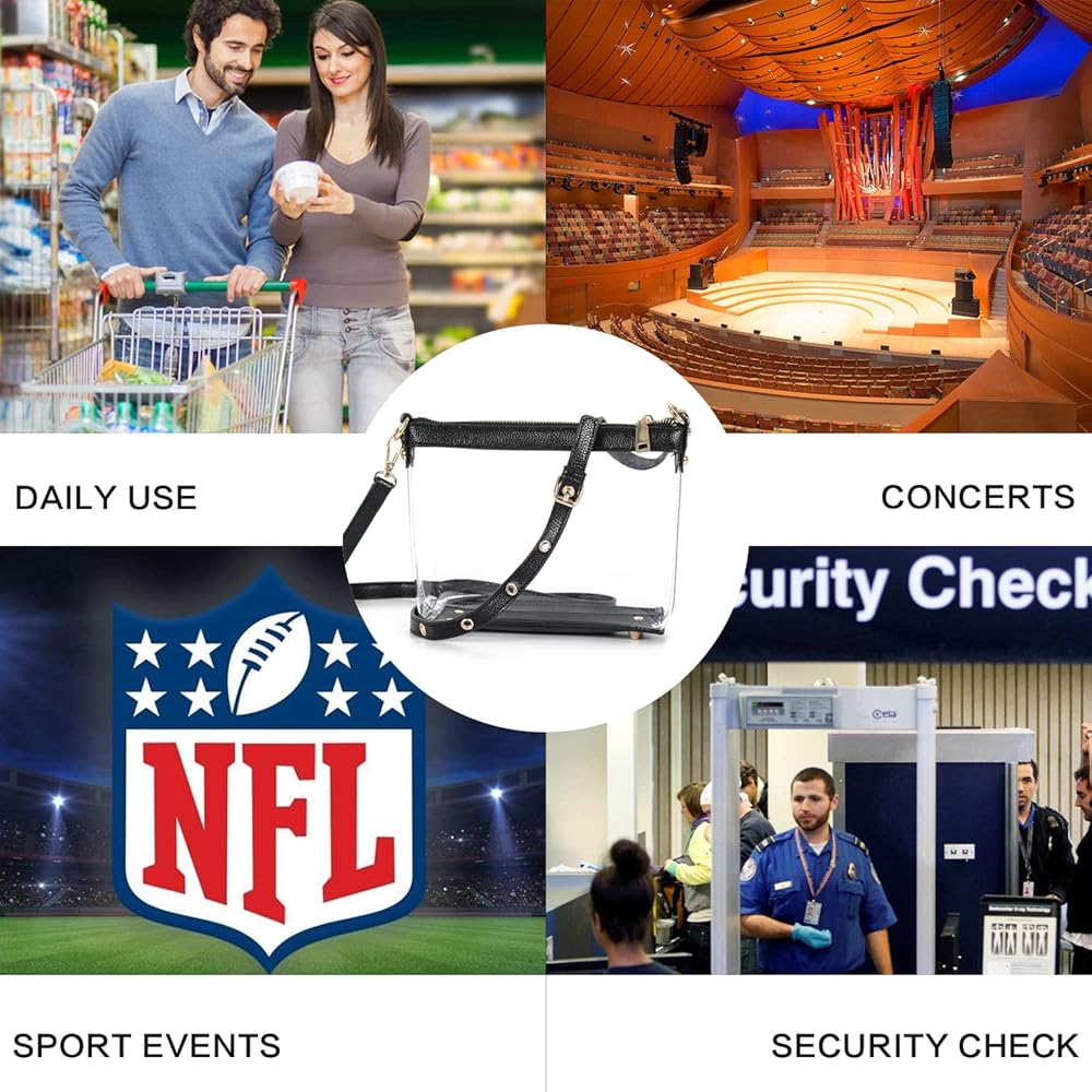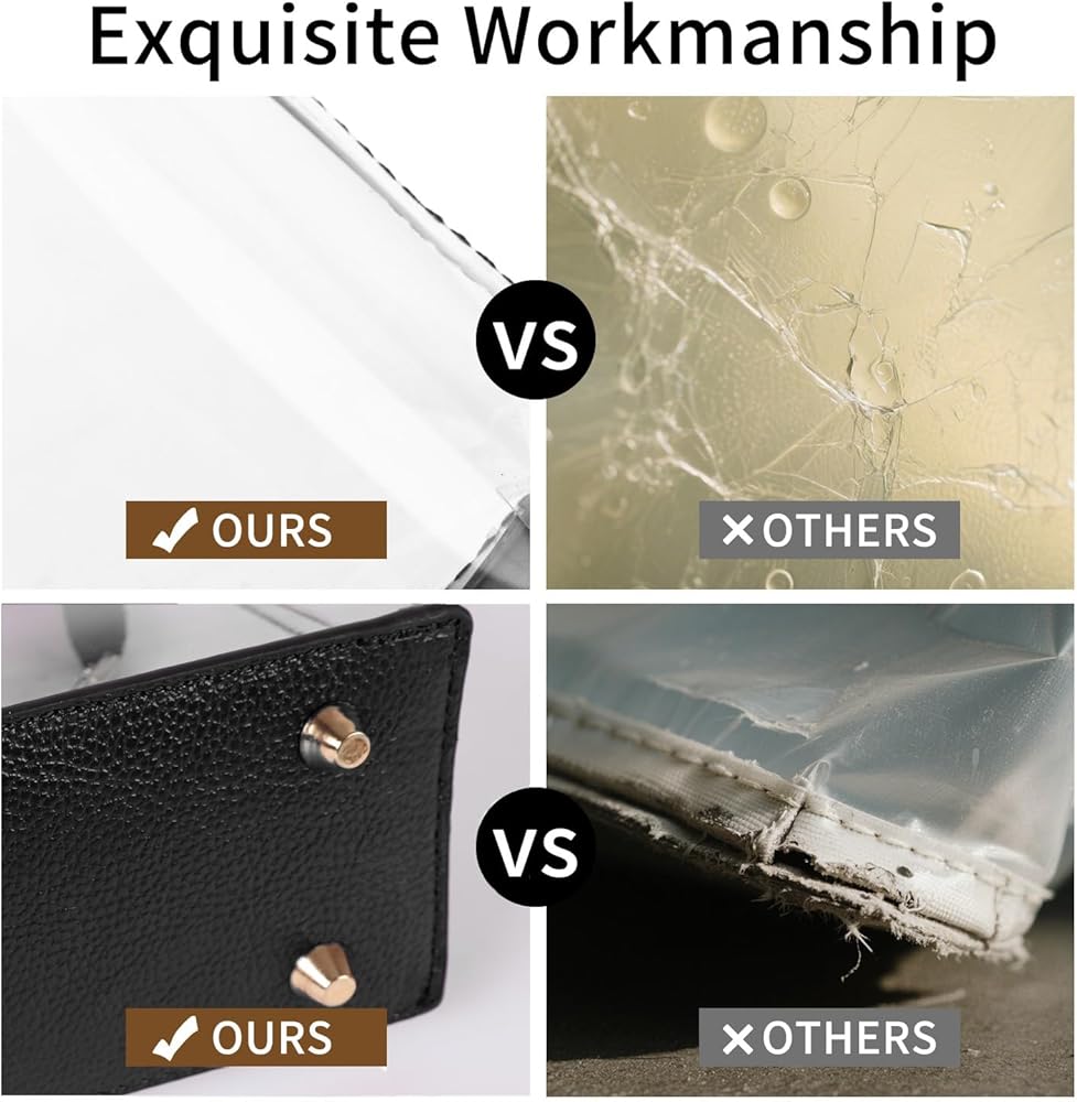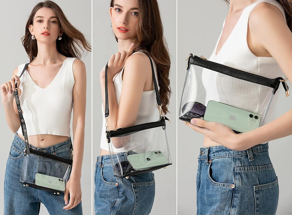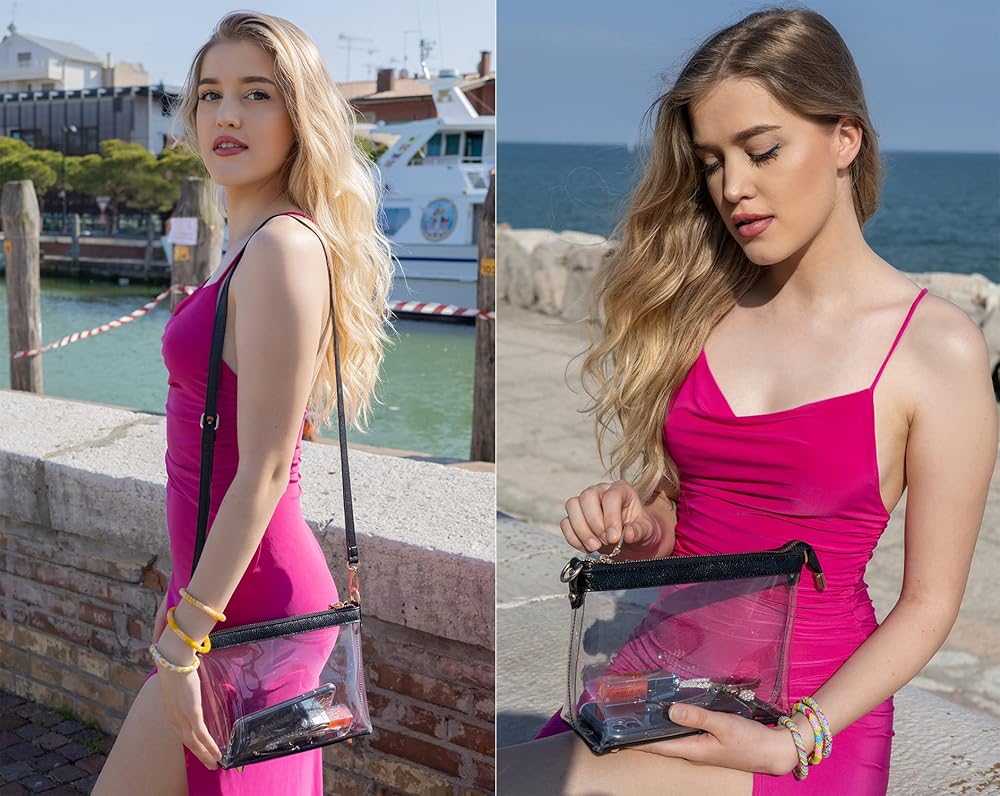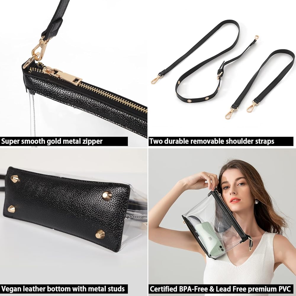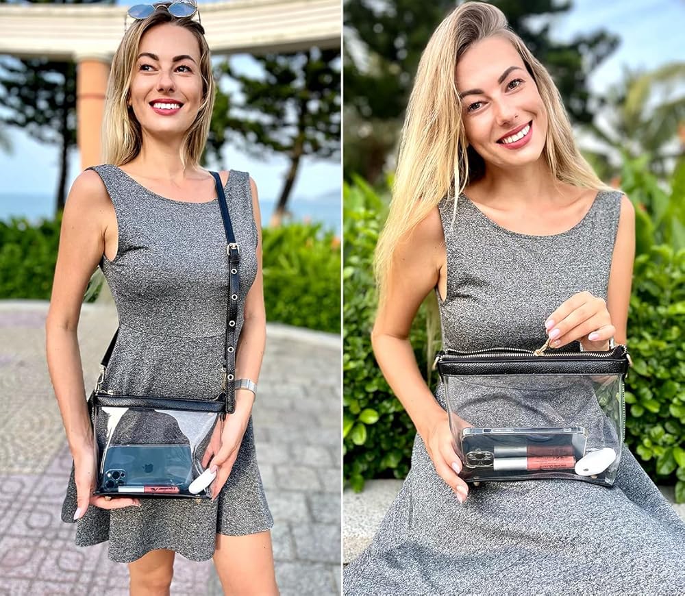 Design Inspiration This clear purse is a classic and atmospheric version. The simple design has no extra embellishments, so we decided to use high-quality materials for every detail, which is very recognizable. The fashionable and removable leather shoulder straps allow you to use it as transparent underarm bag,see through crossbody bag or clear clutch bag. The bag's capacity can meet daily needs, shopping, work,stadium and concert. It will look great with any style of clothing. It's a great gift for women.Product Details: Product:clear zipper purse with vegan leather trim Material: no weird smell thick PVC+Vegan leather Size: 9.4''(L)x 6.7''(H)x 3.5''(W) Structure: one gold metal zipper compartment Weight:325g/0.72pouds 2 Removable Shoulder straps: 1 hand leather strap +1 adjustable leather shoulder Product Description: 1.Our clear zipper bag is transparent and bright in texture, tough and wear-resistant, not easy to scratch, and vegan leather edging, which increases fashion and eye-catching. 2.The comfortable curved leather shoulder strap is firm and durable, and fits the shoulder just right, making it comfortable and easy to carry on the shoulder. 3.y&r direct Clear stadium bag is widely used in all kinds of occasion, such as,concert, football game, beach, shopping, work, travel or vacations. It's a decent gift for Christmas/ valentines/ birthdays/ mother、wedding. 4.EASY TO MAINTAIN: clear bag stadium approved is made of thick sturdy PVC and vegan leather, it's very durable and easy to clean, simply just wipe with water to keep this bag looking new. 5.Kindly Reminder: The manual measurement method is different, and the error of 1-3cm is normal. 6.LIFETIME MONEY-BACK GUARANTEE: We gladly give you 100% refund if you are not satisfied with our Y&R Direct clear zipper bags. No questions asked! So please purchase with confidence.
