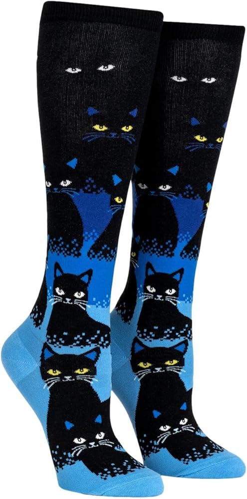 Knee high cat socks for women from Sock It To Me. Ideal for anyone that loves cats. Our threads are certified by OEKO-TEX Standard 100, which means we leave out harmful chemicals to keep your skin safe and happy. Approximately fits women's shoe size 5-10.