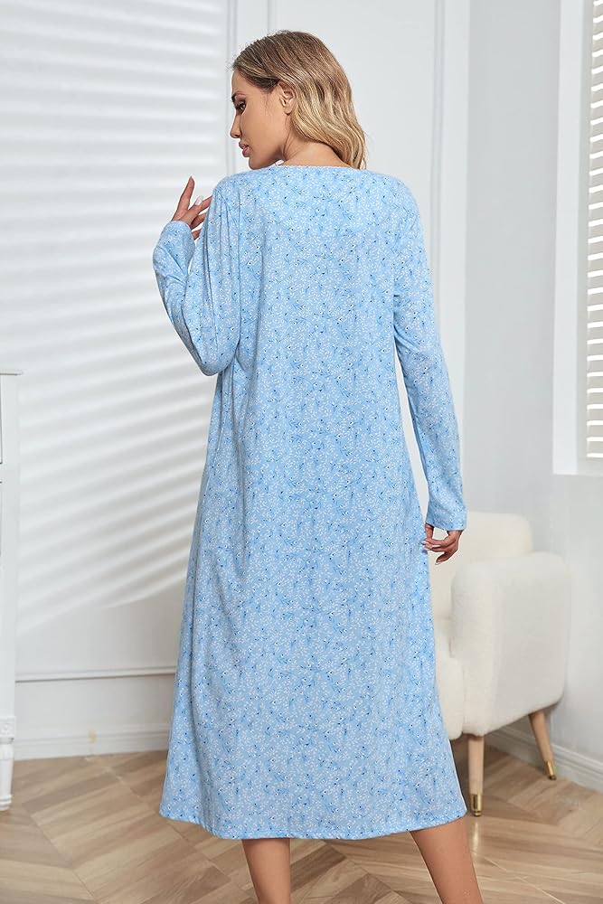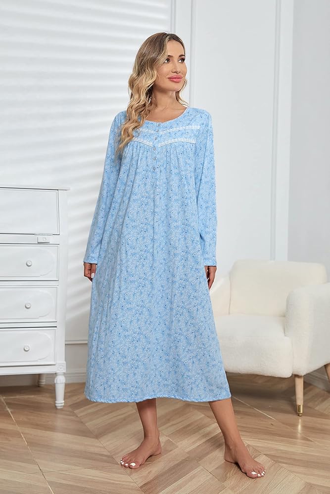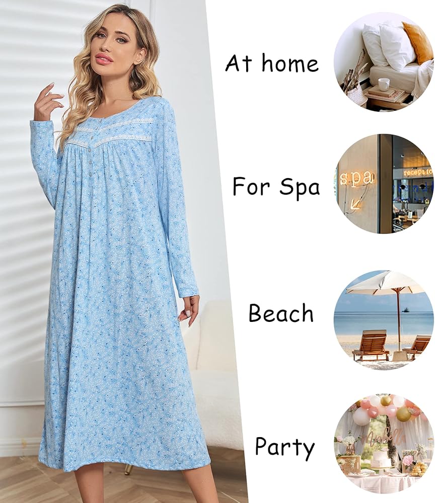 ✔Feature about Long Sleeve Cotton Nightgowns: Long sleeve & long length design will keep your warm in air-conditioner room and fall & early winter, cute scoop neck with tiny lace trim, shining shell buttons are easy on and off, great mid-calf length and loose fitting.