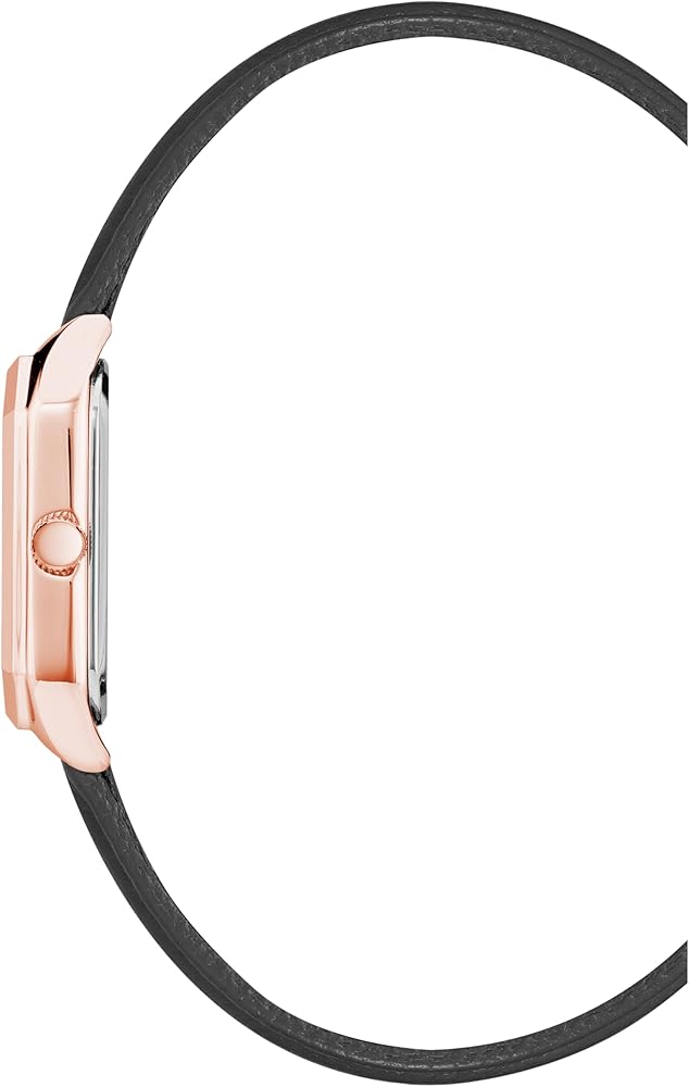 - Glossy black dial with gold-tone hands and markers