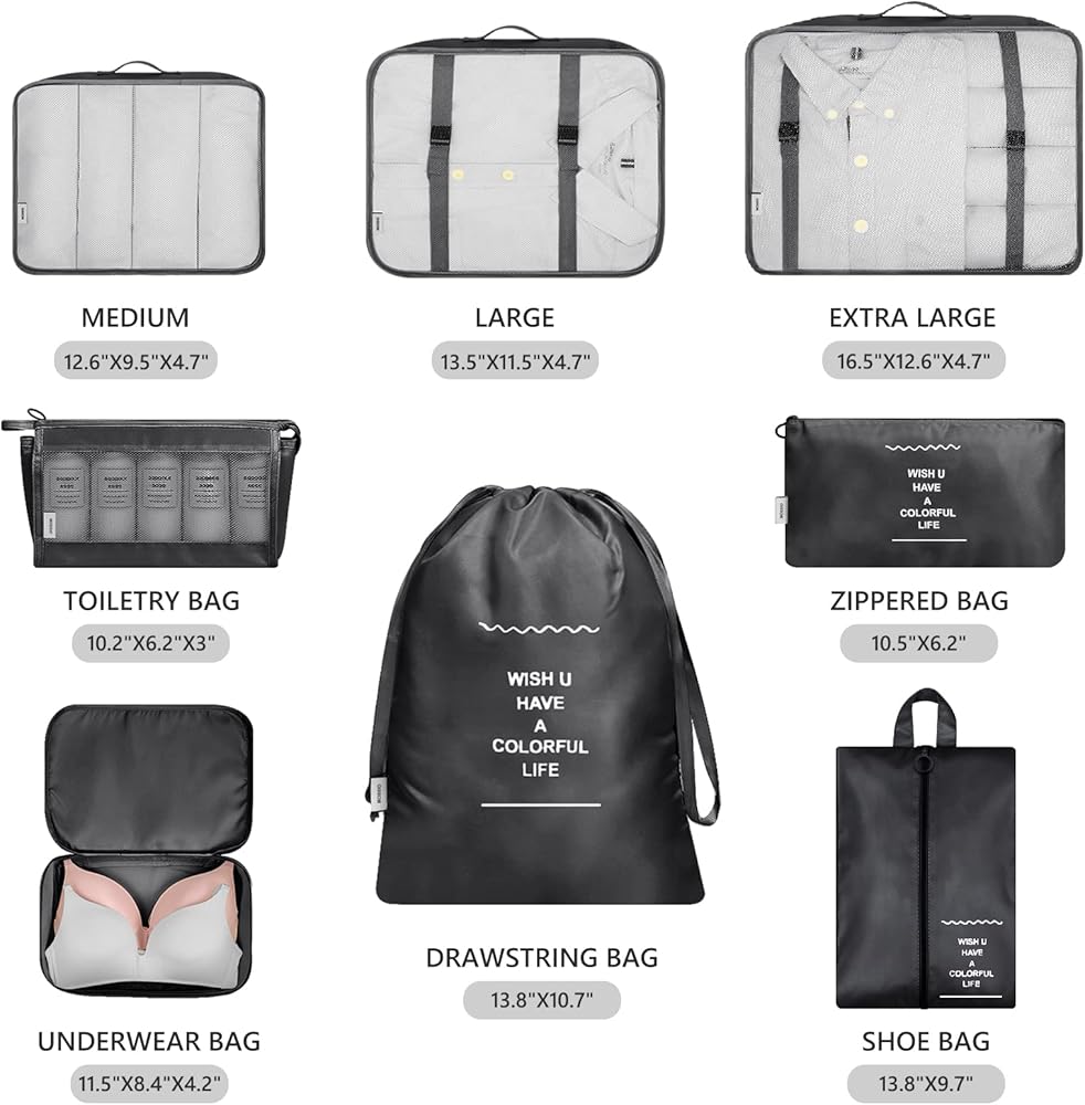 THE PACKING CUBES FOR EVERYWHERE YOU GO - 3 X different size Packing Cubes, 1 X Bra Underwear Bag, 1 X Toiletry Bag, 1 X Drawstring Laundry Bag, 1 X Shoe Bag, 1 X Zippered Bag. A must-have travel accessory. Ideal for active lifestyles including traveling, backpacking, camping, gym or beach