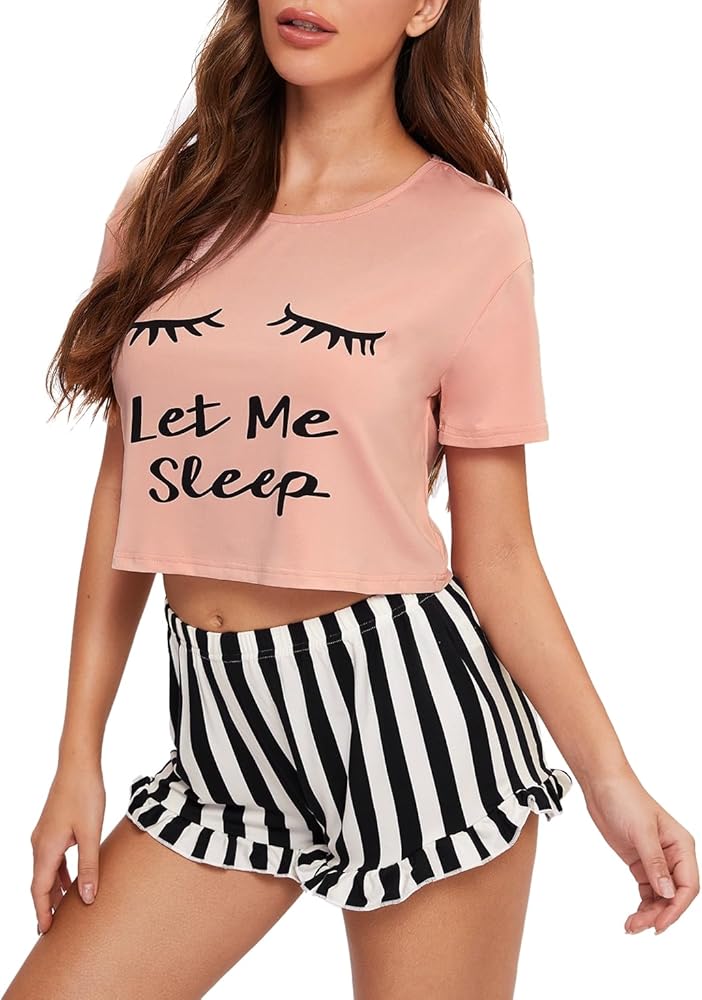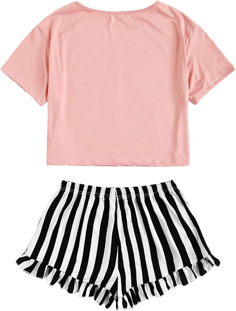 WDIRARA Women's 2 Piece Pajama Set Tee and Striped Shorts Cute Pjs Set Sleepwear Loungewear Outfits