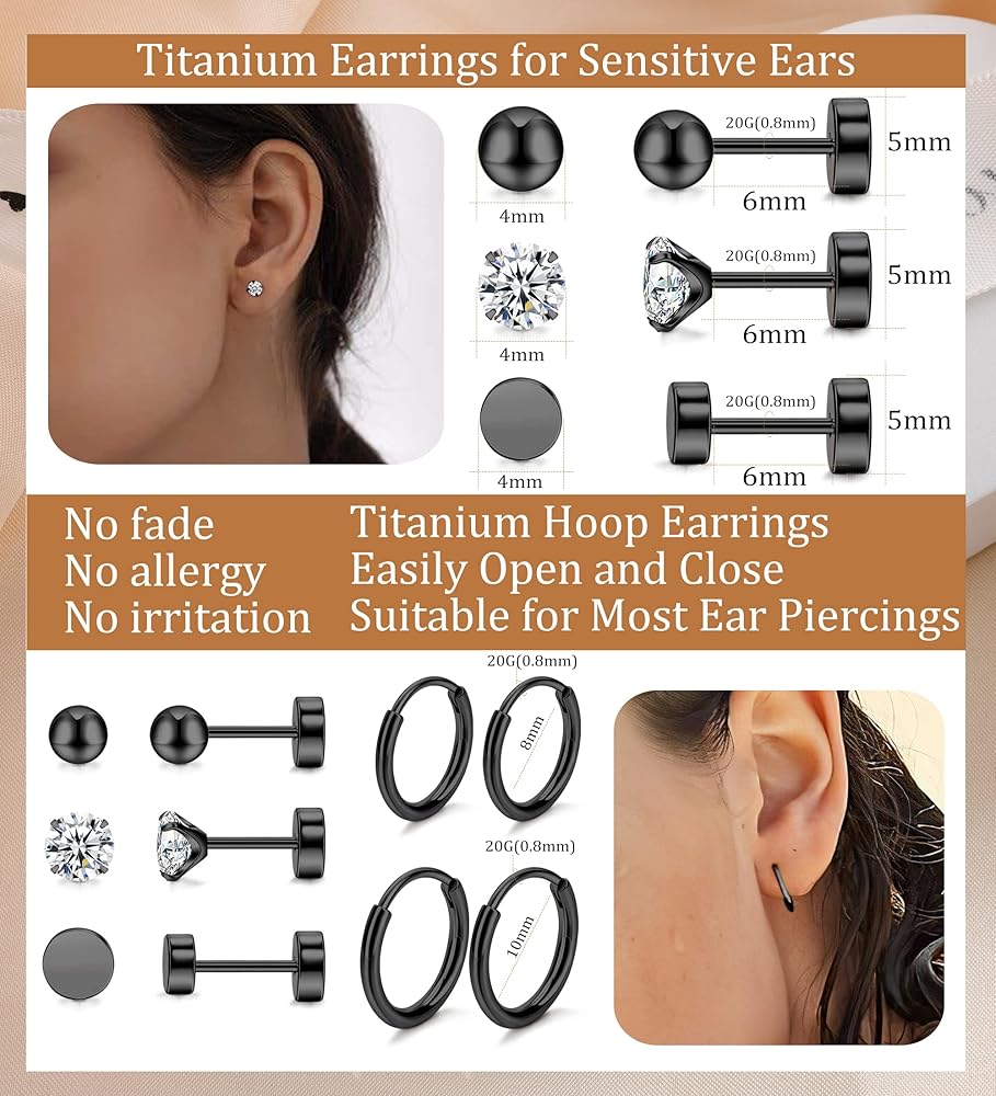 💎Titanium Earrings Set: 💎G23 Titanium earrings are a great jewelry material. Titanium stud earrings are made from pure titanium, No allergy, No irritation, our pure titanium earrings are implant grade titanium earrings, Nickel-free, and Lead-free. Let everyone wear safety and comfort, especially for sensitive skin.