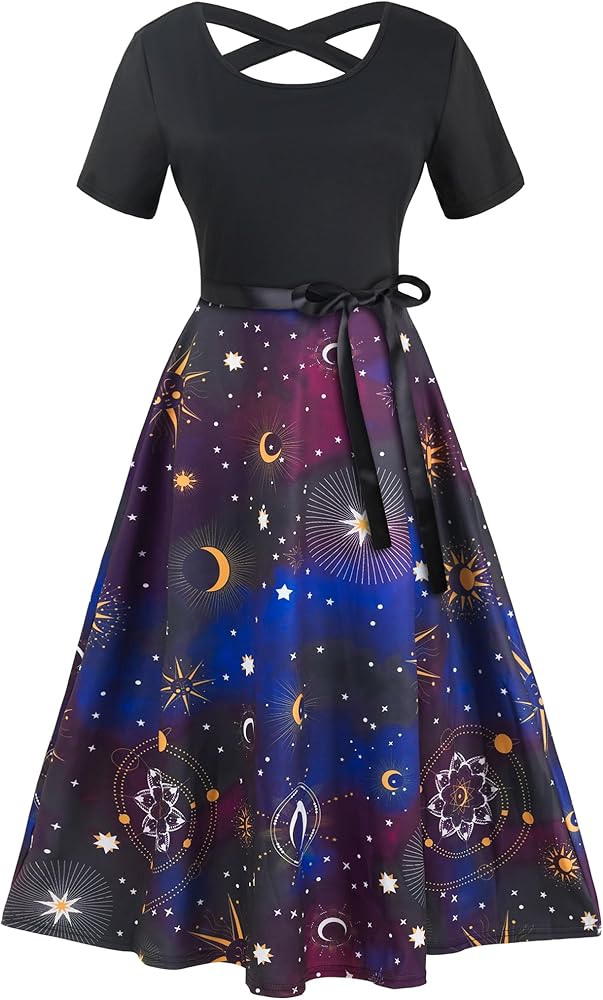 Patterned with sun moon star print, this casual midi dress featuring a scoop neck and criss-cross back. The bowknot belt is removable so that you can easily replace it to any of your favorite belt
