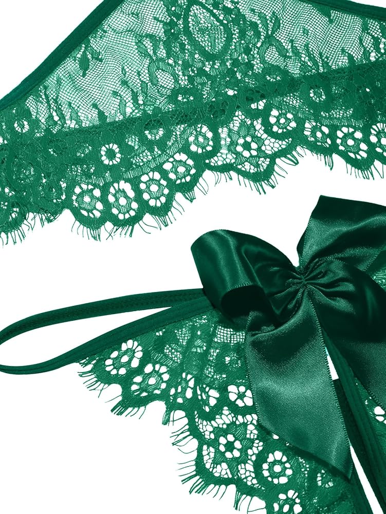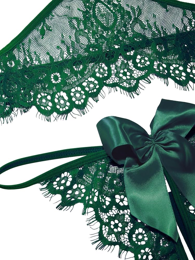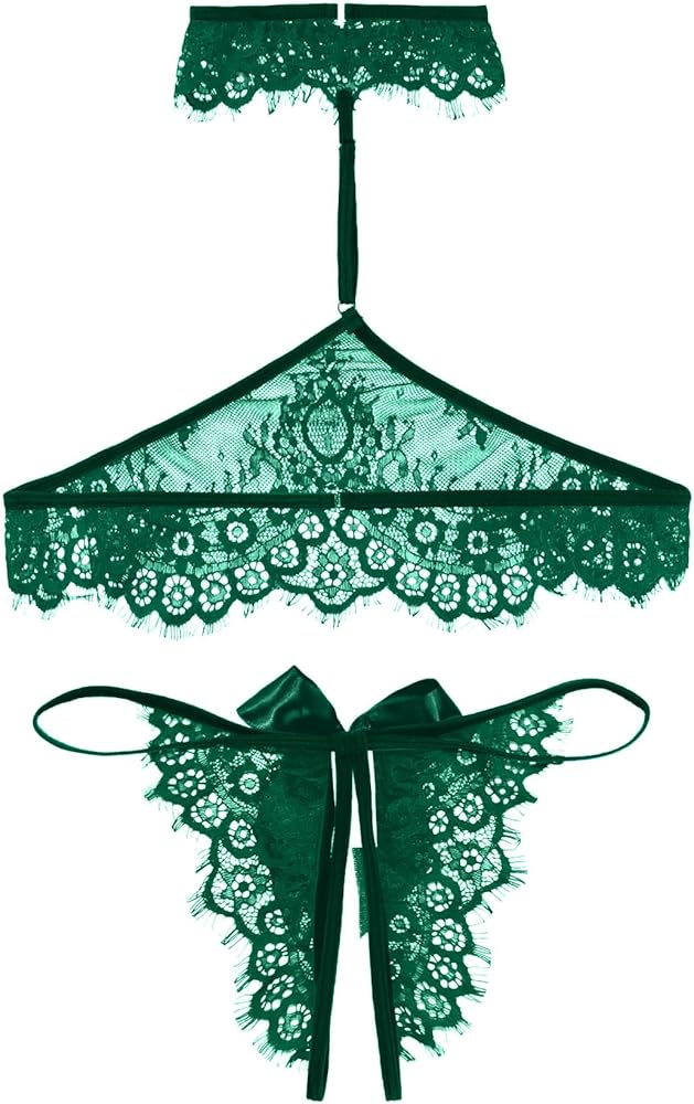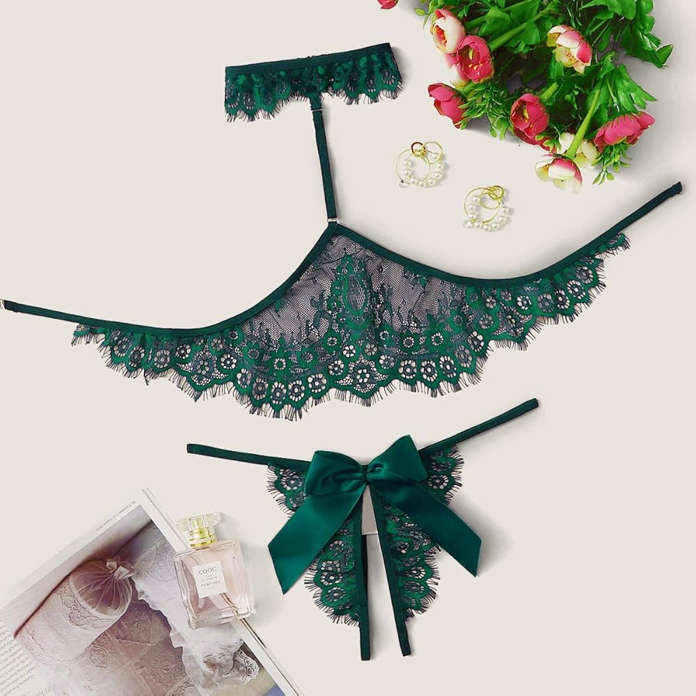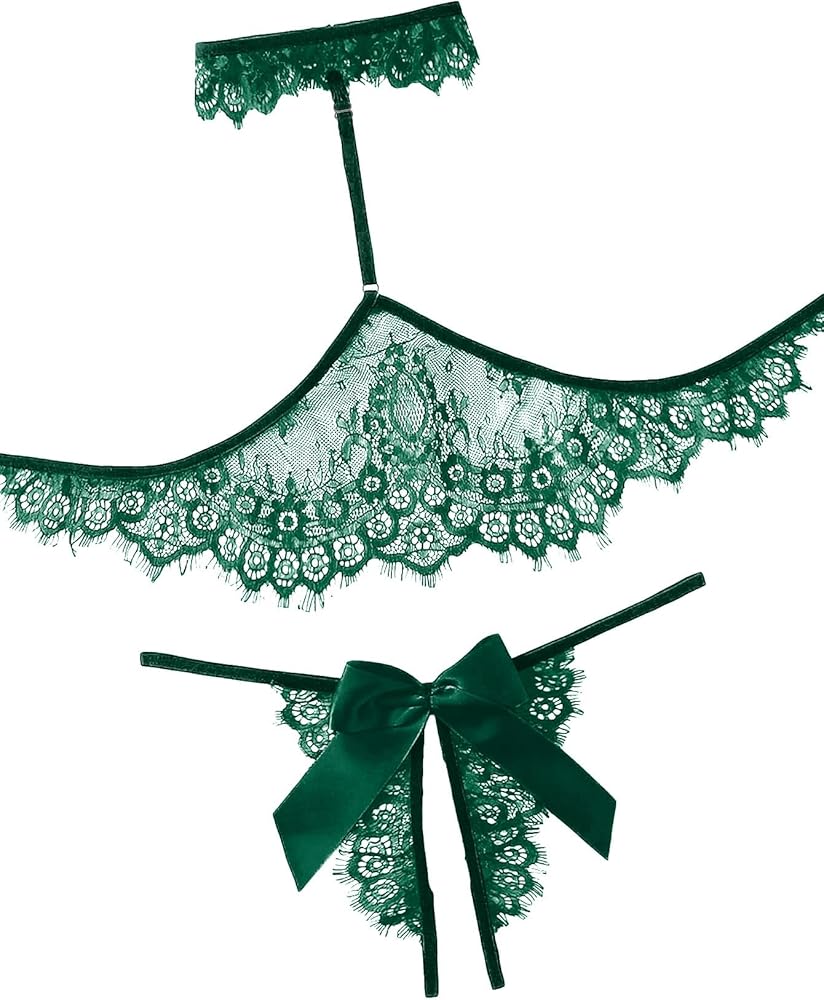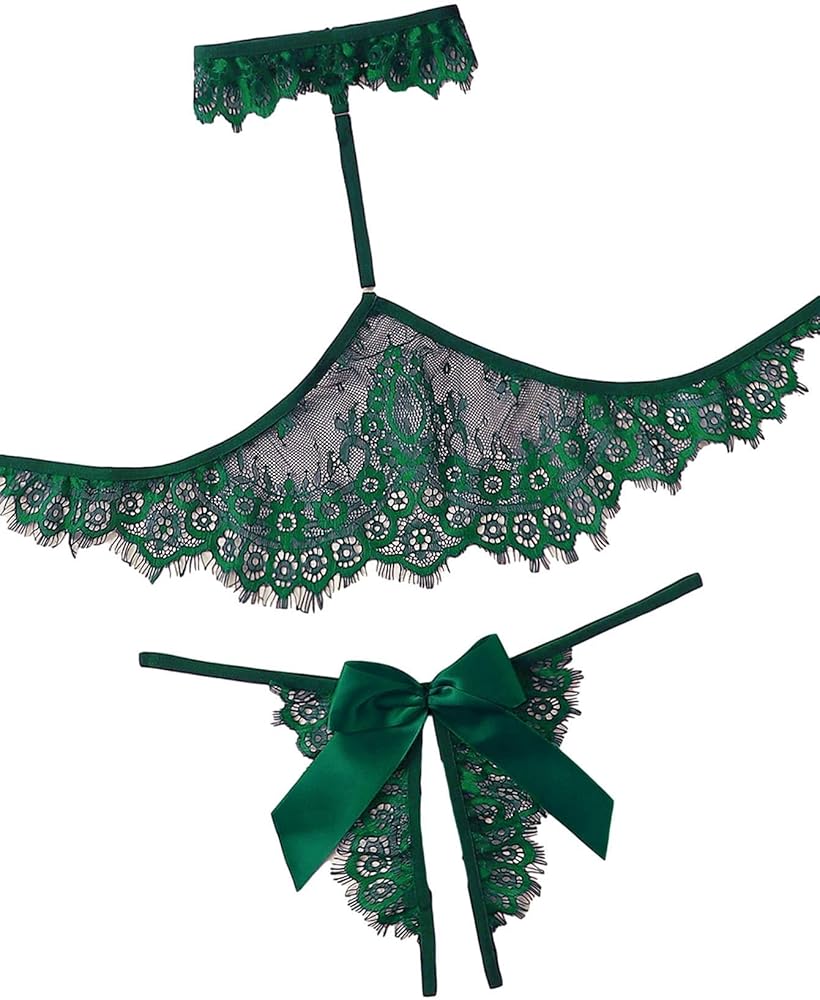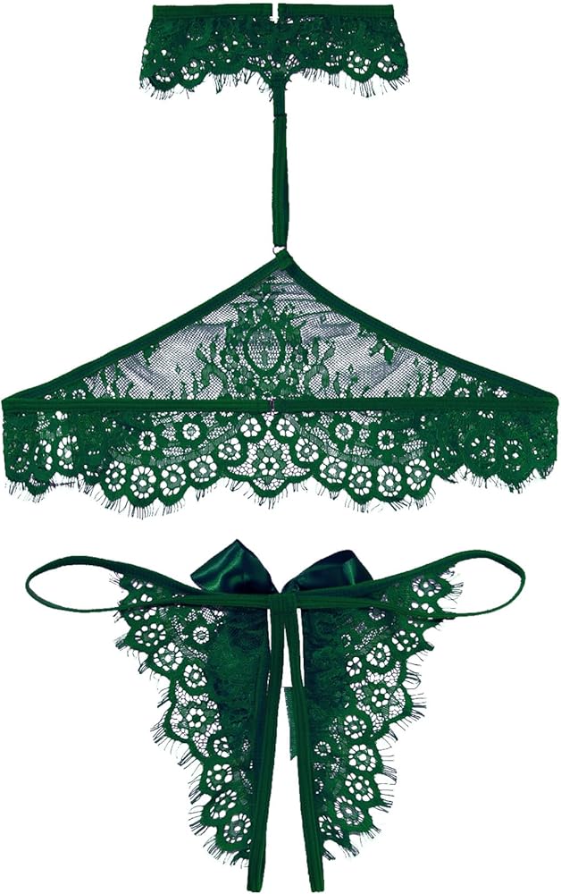 Lilosy Sexy Bow Choker Halter Floral Lace Sheer Lingerie Set for Women See Through Bra and Panty 2 Piece