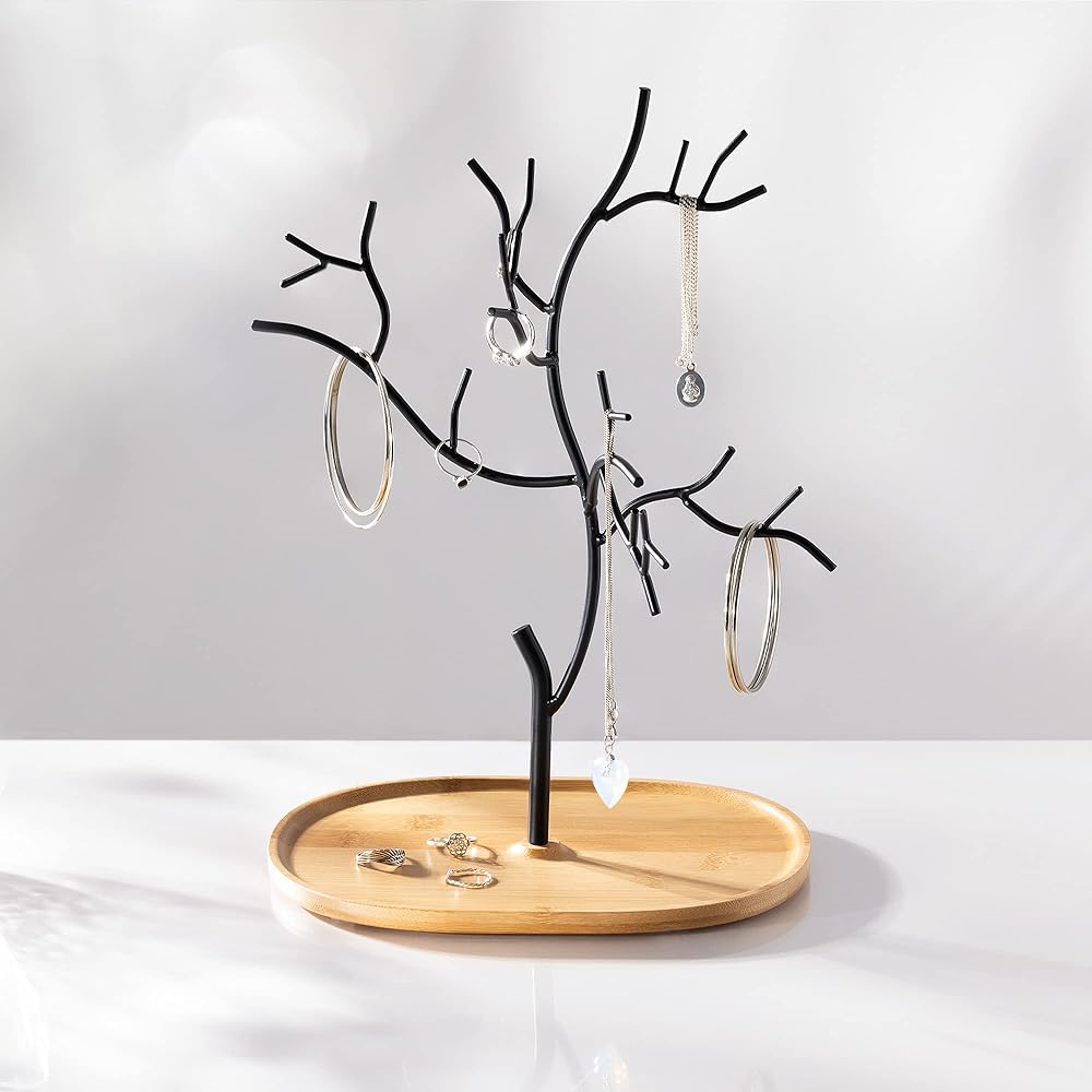 ACCESSORIES ORGANIZER: The sturdy metal "branches" provide the perfect place to hang and hold various sizes of necklaces, bracelets, rings, earrings and watches. The bamboo base doubles as a jewelry dish to hold ear studs and other loose trinkets.