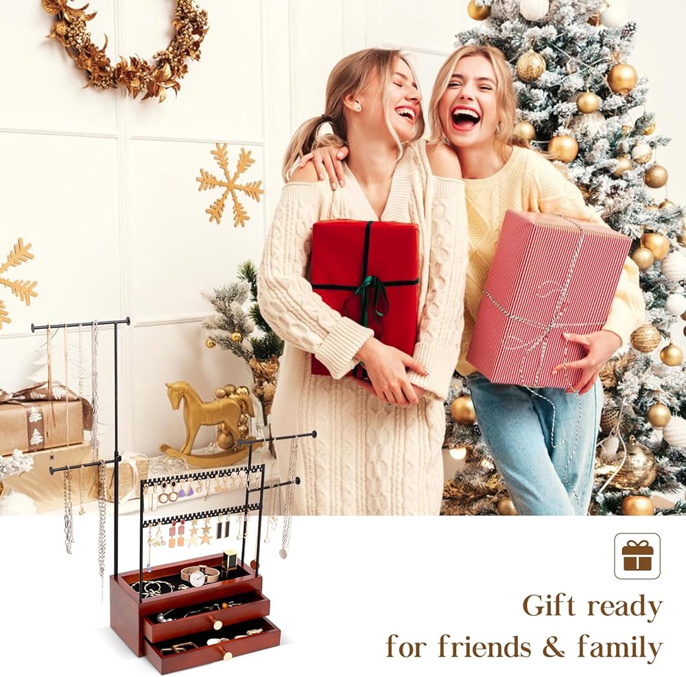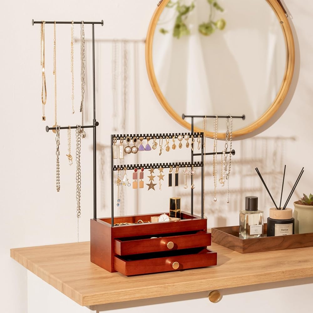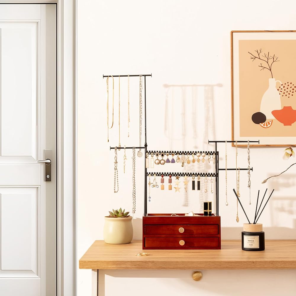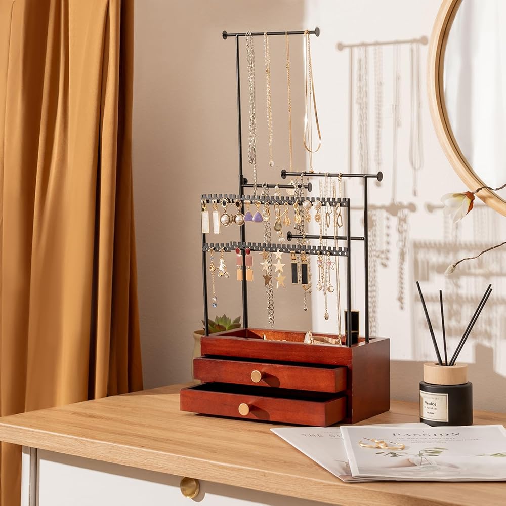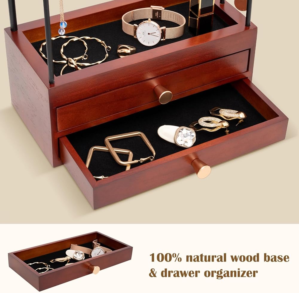 ✅ Large Capacity - This ProCase jewelry stand is equipped with double layer jewelry storage drawer box and jewelry tree branches, displaying and organizing all necklaces, bracelets, earrings, ring while keeping them tangle-free, so much easier and faster to see what you have, access everything very easily