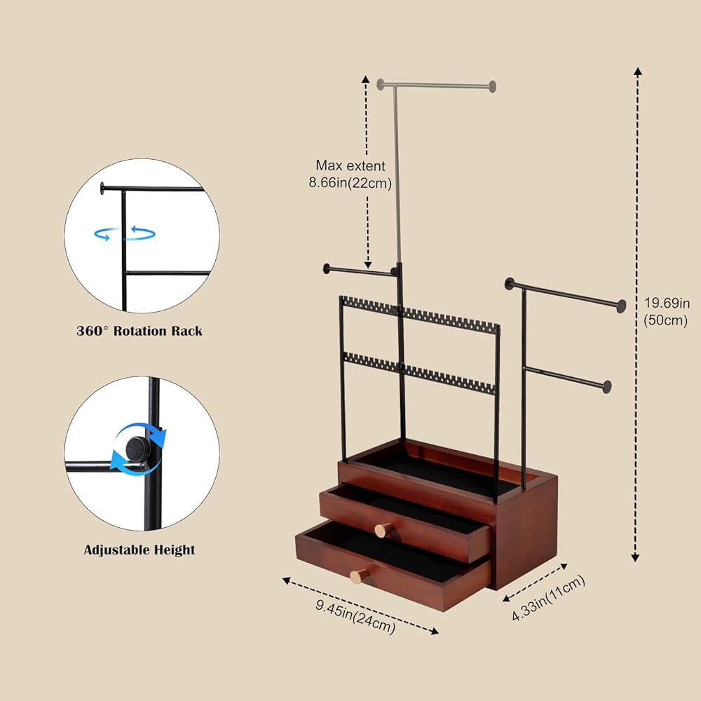 ✅ Height Adjustable - The top tier measures 11.03 inches and is 8.66 inches extendable suggested for hanging long necklaces, you also can rotate the angle according to your preference