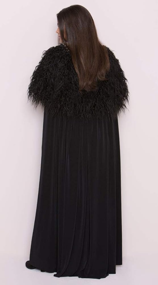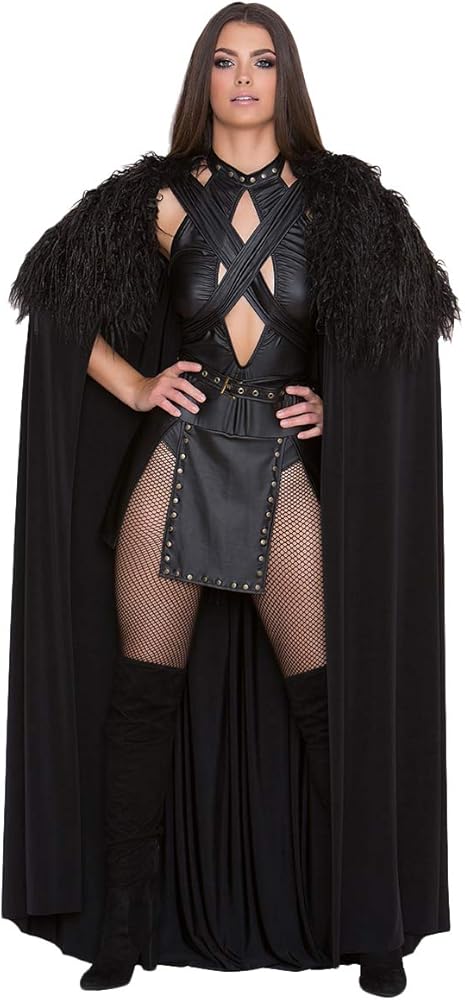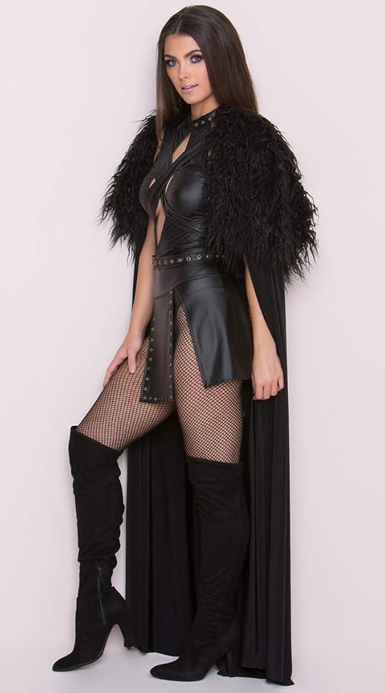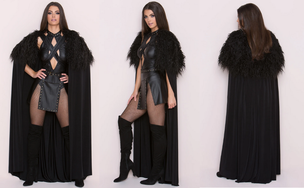 Exclusive Sexy Northern Queen costume featuring a black romper with a high neckline, gold stud accents, a cut-out bodice panel, draping panels with studded accents, an adjustable waist belt with a bronze buckle, a cheeky cut back, and a long black cloak with a faux fur trim and a criss-cross tie closure