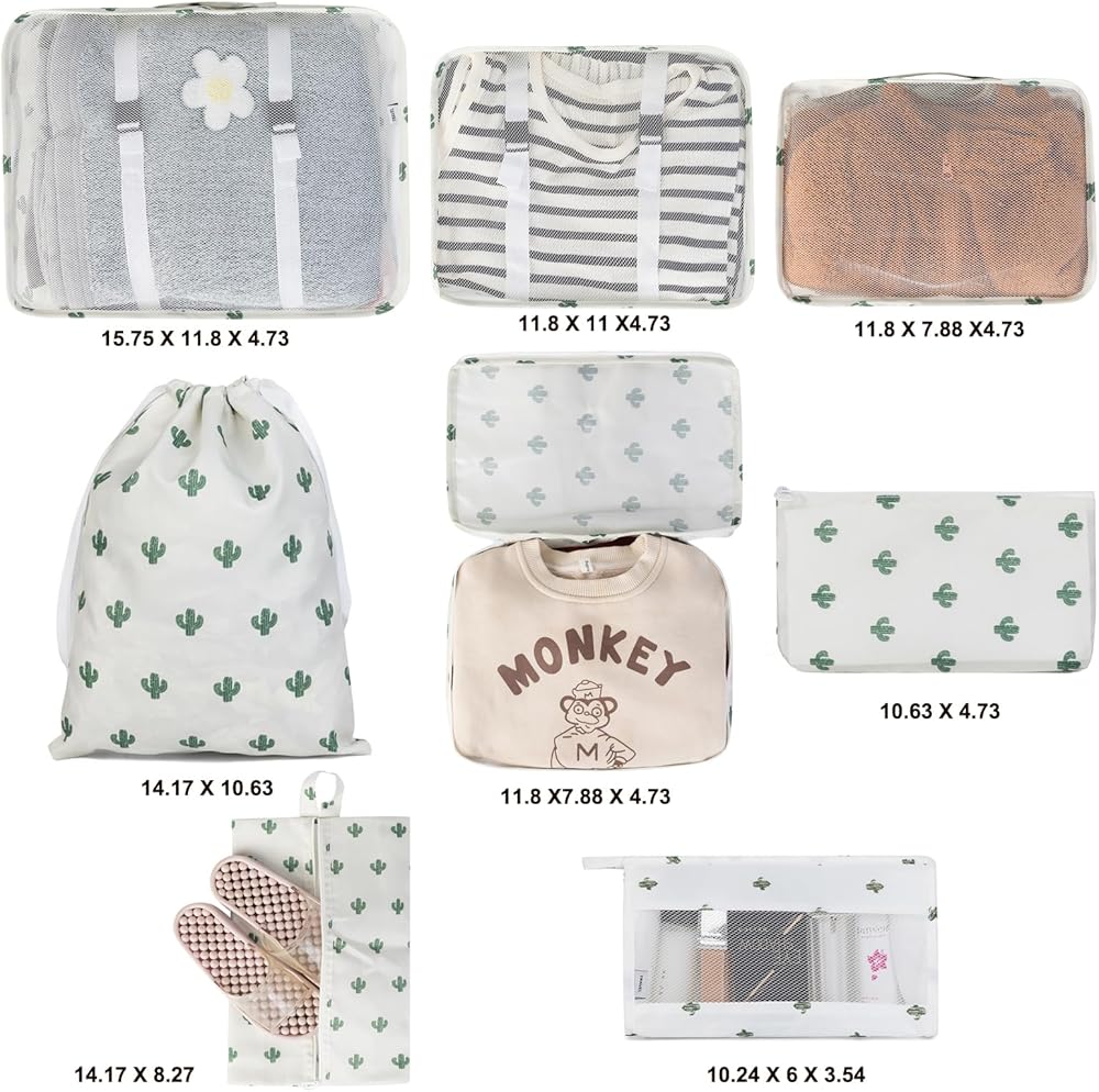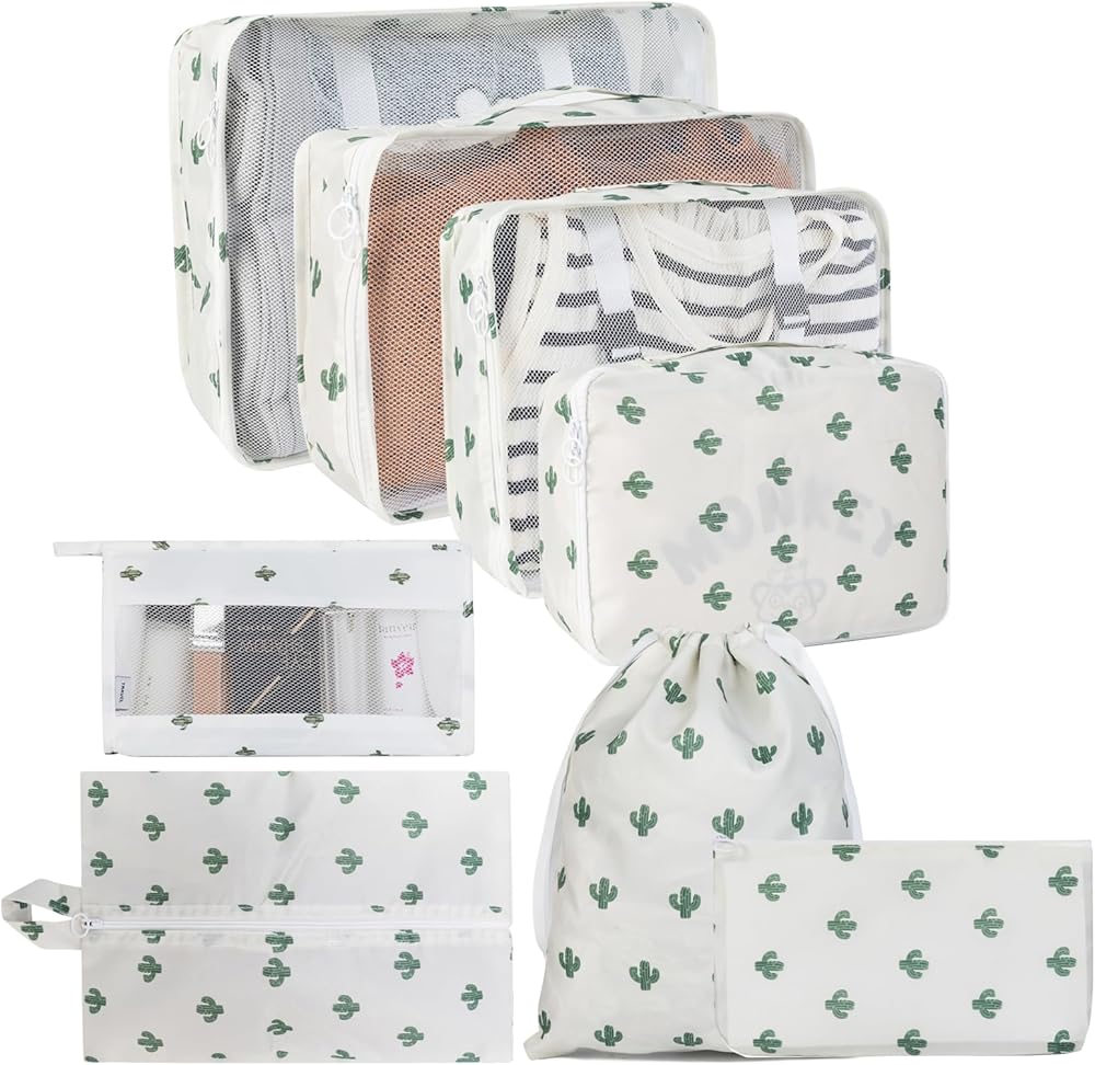 8 Pcs Packing Cubes: This suitcase organizer bags set includes 3 sizes (L M S)of travel organizers packing cubes, 1 underwear bag for bras and underwear, 1 portable shoe bag, 1 toiletry bag, 1 flat pocket, 1 drawstring bag . Travel in comfort and style with these reliable and attractive travel accessories.