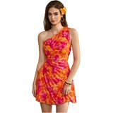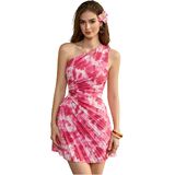 - Floral print, strapless, sleeveless, lettuce trim, drawstring waist, short dress