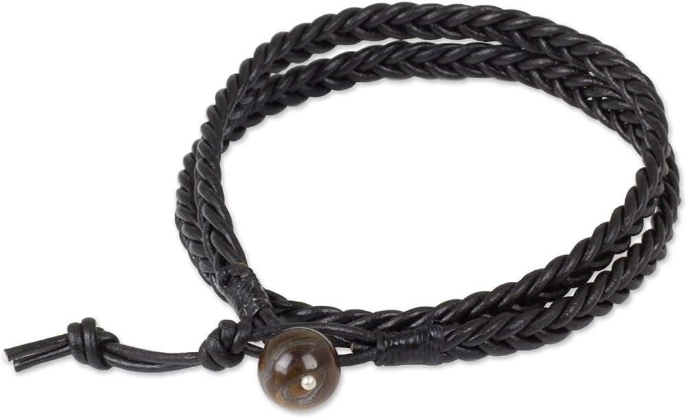 About this item: Braided by hand, strands of black leather wrap twice around the wrist in a bracelet. Chaloemphon adds a honeyed tiger's eye bead to form the clasp in this handsome design for men.