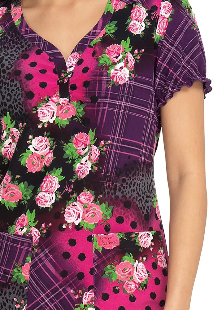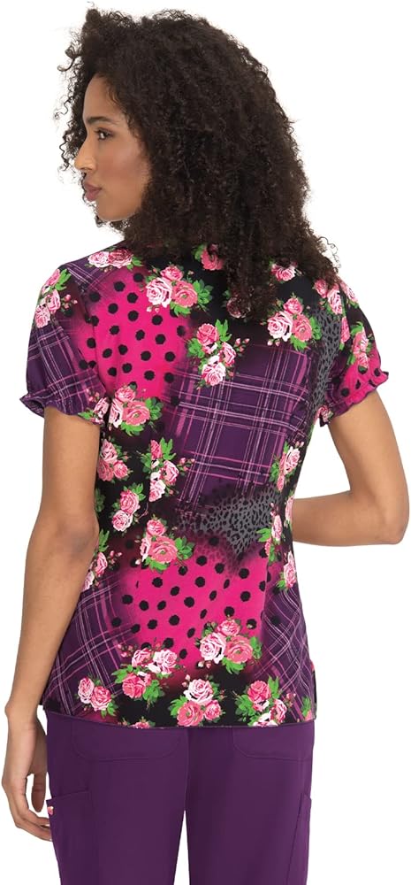 Fun and flirty print scrub top with 4-way stretch. Contemporary fit. Heart-shaped neckline 2 front pockets Gathered sleeves Side slits Length, size Small: 27" 90% polyester, 10% spandex 4-way stretch 2-Pocket Stretch