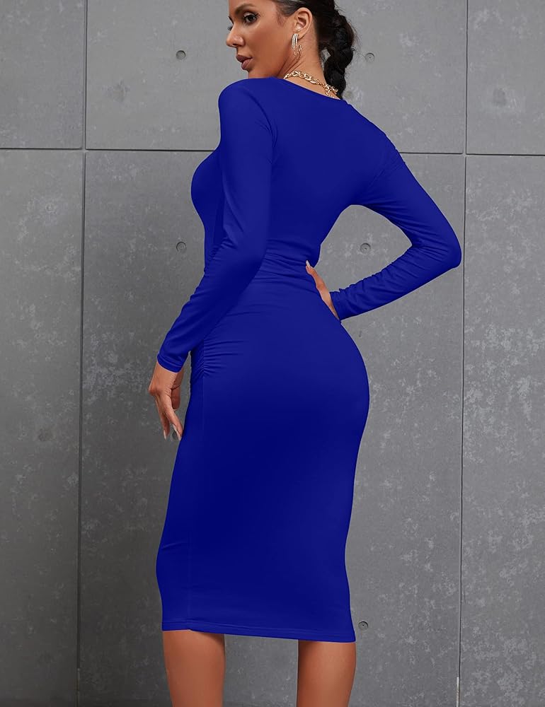 This tight club dresses feature ruched detail at waist, crewneck, long sleeve, midi length, bodycon fitted. The elegant sheath dress can be pulled down to knee length or below, taking it as clubwear, night out dress, evening party dress, body contour dress, maternity dress and baby shower dresses for pregnant women. The trendy pencil dress is a must have in your wardrobe, It hugs all your curves so comfortably, and doesn't ride up or get out of place