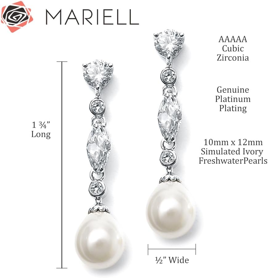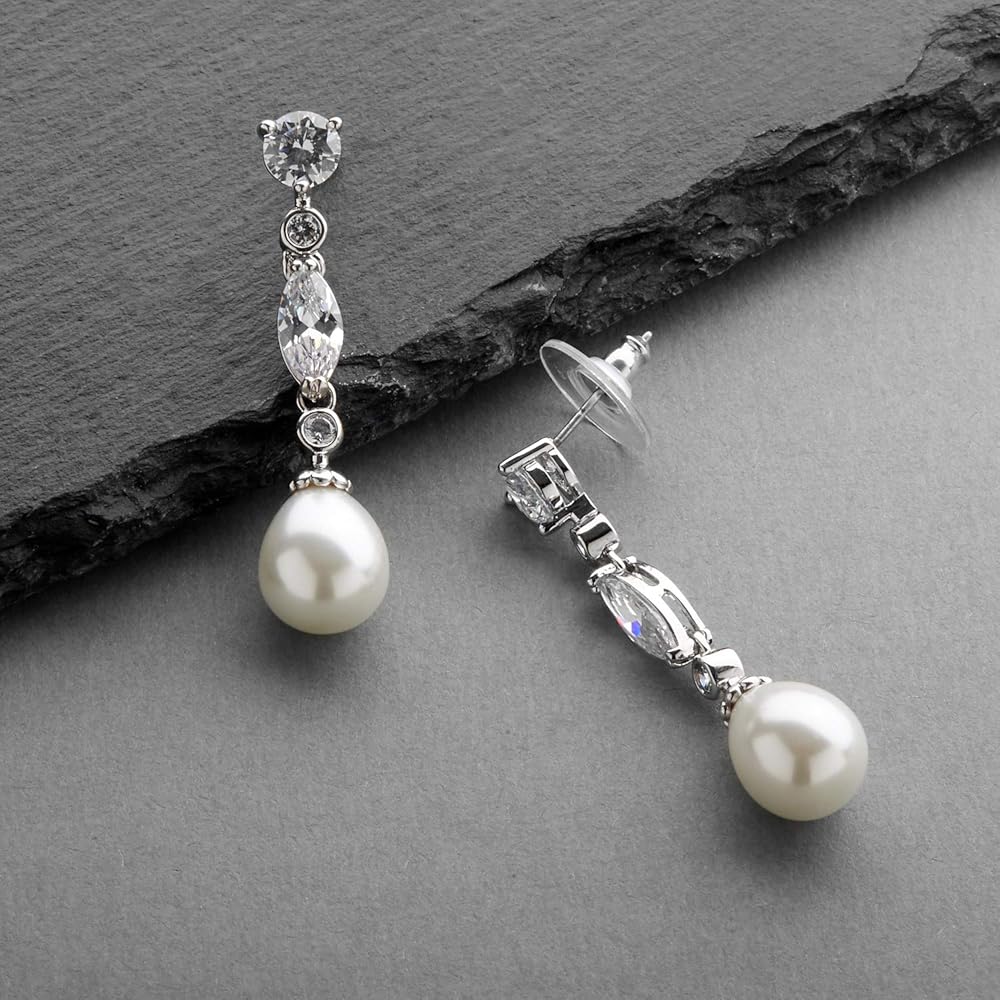 LUXURY STYLE: Glamorous Bold Pearl Dangle Bridal Earrings; Sparkling Mixed Shaped Pronged and Bezel-set CZ Gems with Striking Light Ivory Pearl Teardrops; Genuine Silver Platinum Plating with the Look of Fine Jewelry