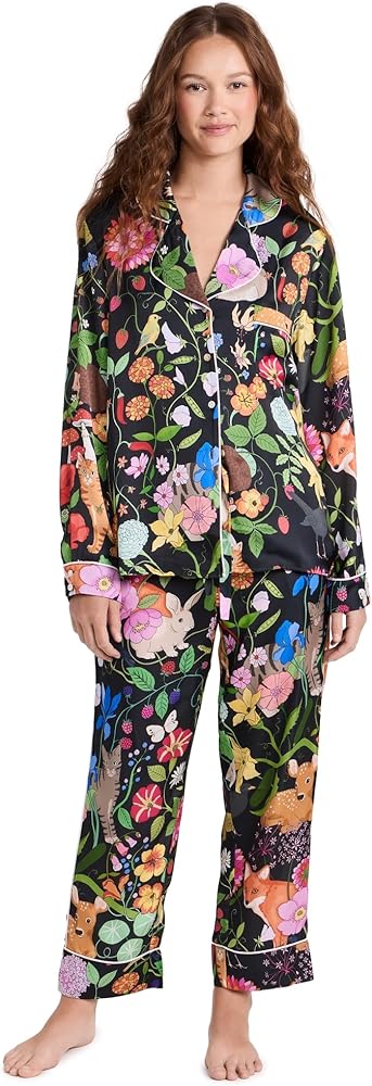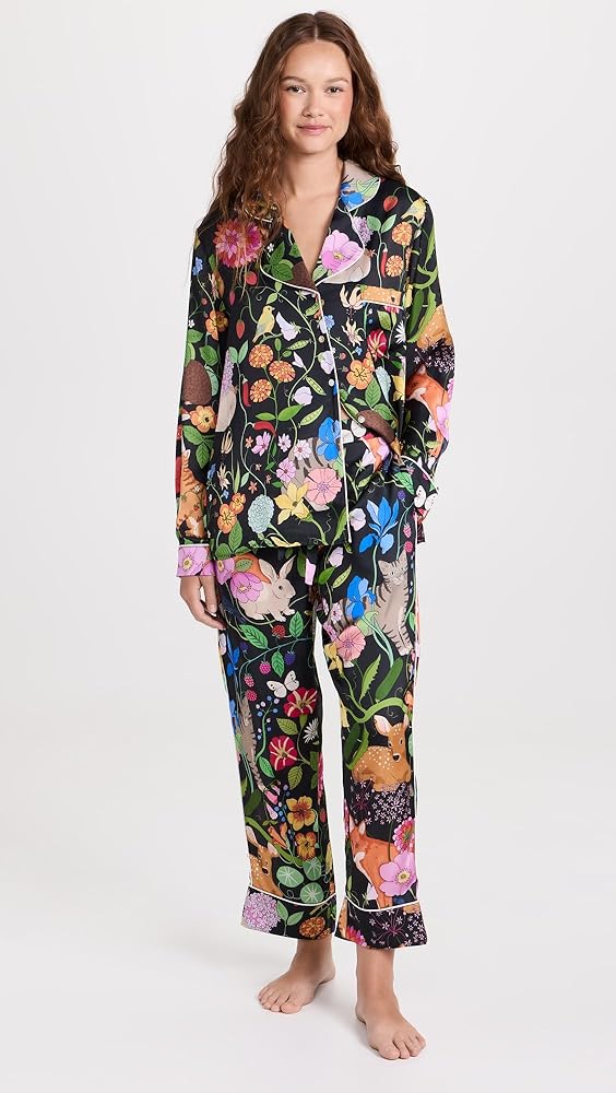 A lavish and lovely garden-themed print details this silky Karen Mabon pajama set, which comes with relaxed pants and a long sleeve button up top.