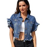 - ❤ Cropped Denim Jacket,Ruffle Sleeve, Two chest pockets, Turn down collar, Buttons closure.